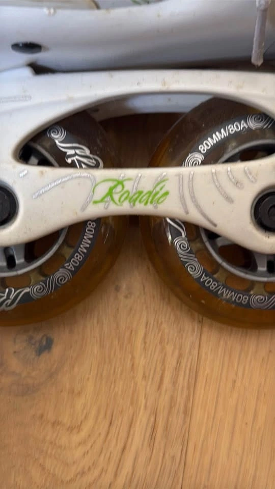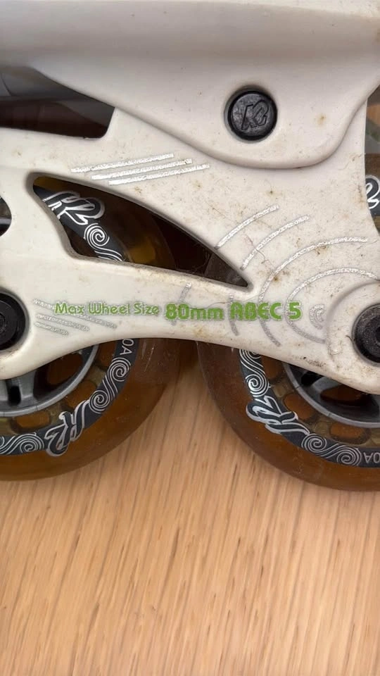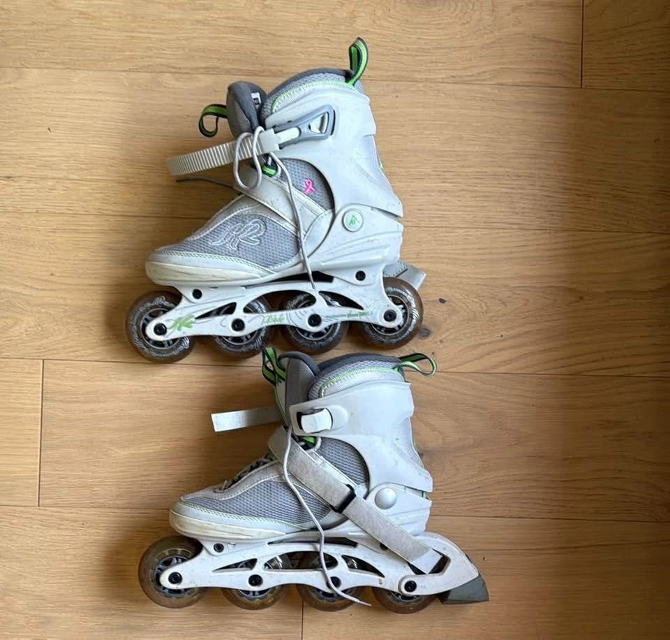 Experience smooth rides with these stylish women's inline skates in gray and green. Perfect for outdoor adventures. Only used a few times. Great condition. Lace up with Velcro and notched fastener for extra fit and comfort. Plush interior lining. Size 8
