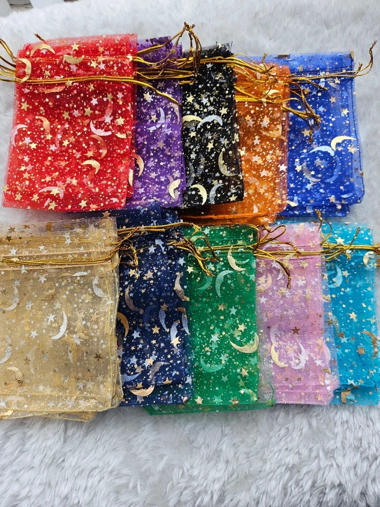 A set of 50 mesh drawstring gift bags, perfect for small items or party favours! They come in a variety of colours and feature a star and moon pattern. Great for adding a touch of sparkle to any gift!