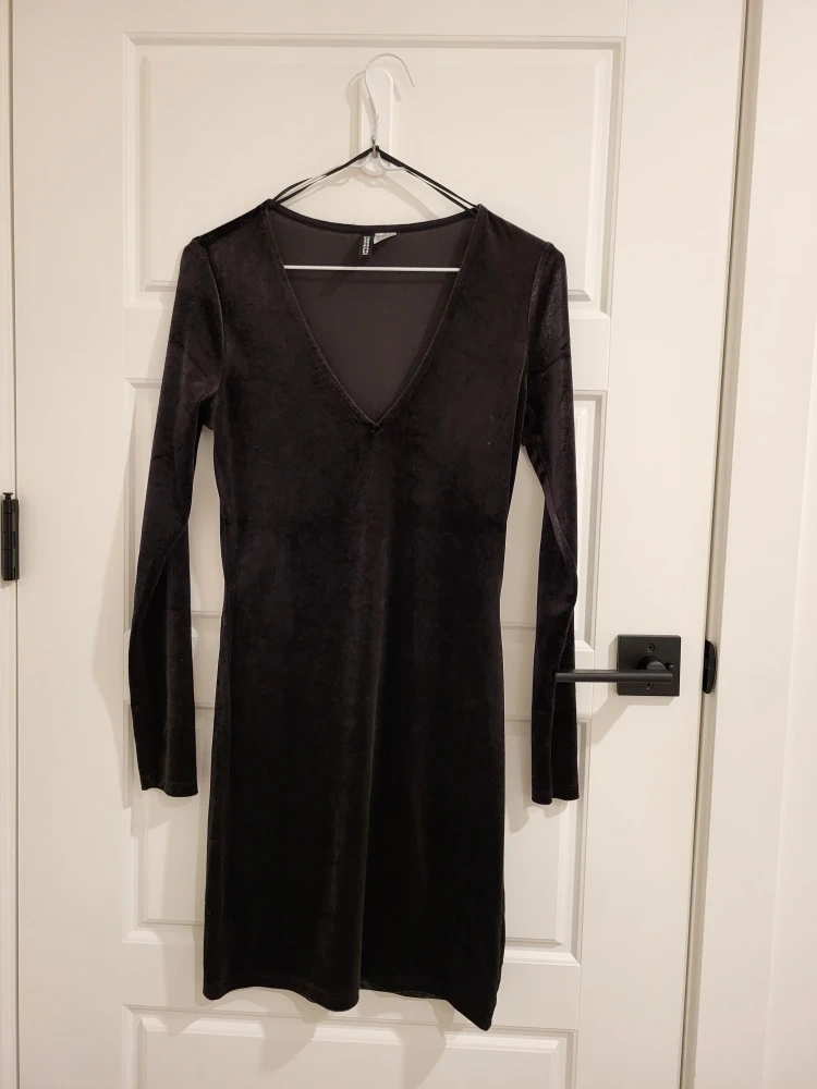 Selling a stylish H&M black velvet mini dress! It's a V-neck design, size 8, that’s perfect for a night out or a casual day. The dress is in great condition and ready to wear.