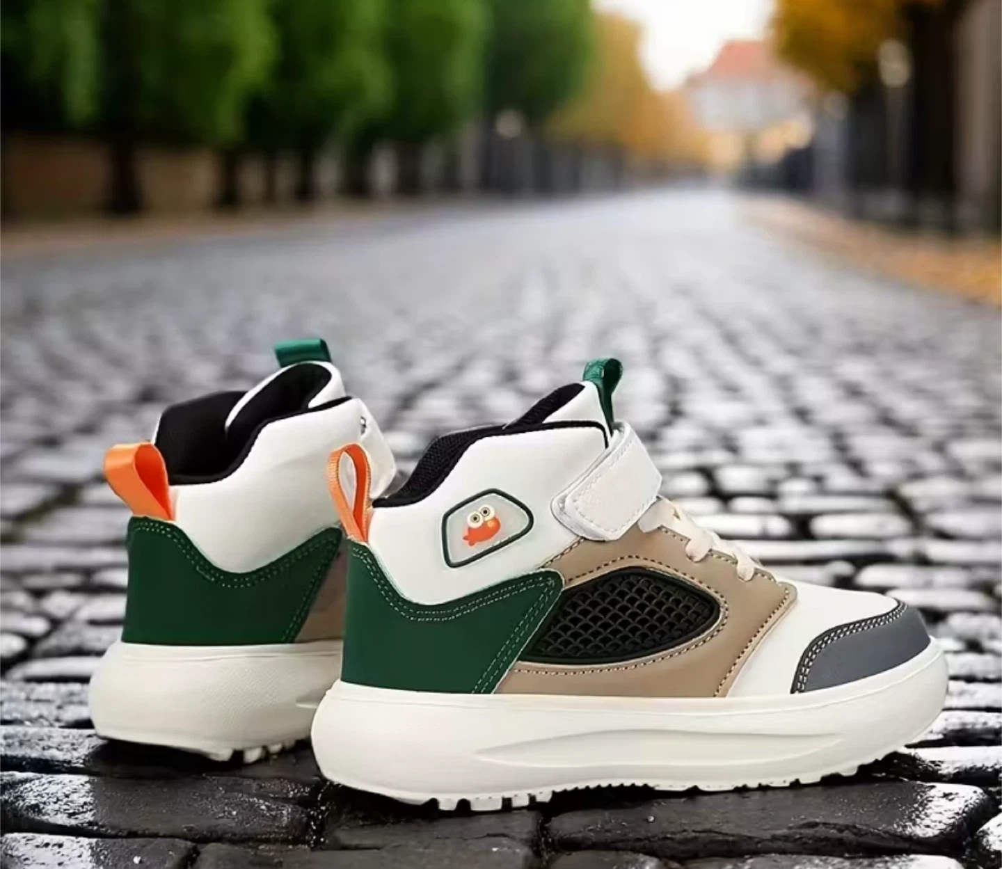 These cute kids' high-top sneakers are in great condition. They feature a mix of white, green, and brown colours, making them versatile for different outfits. Perfect for active kids! Size 33