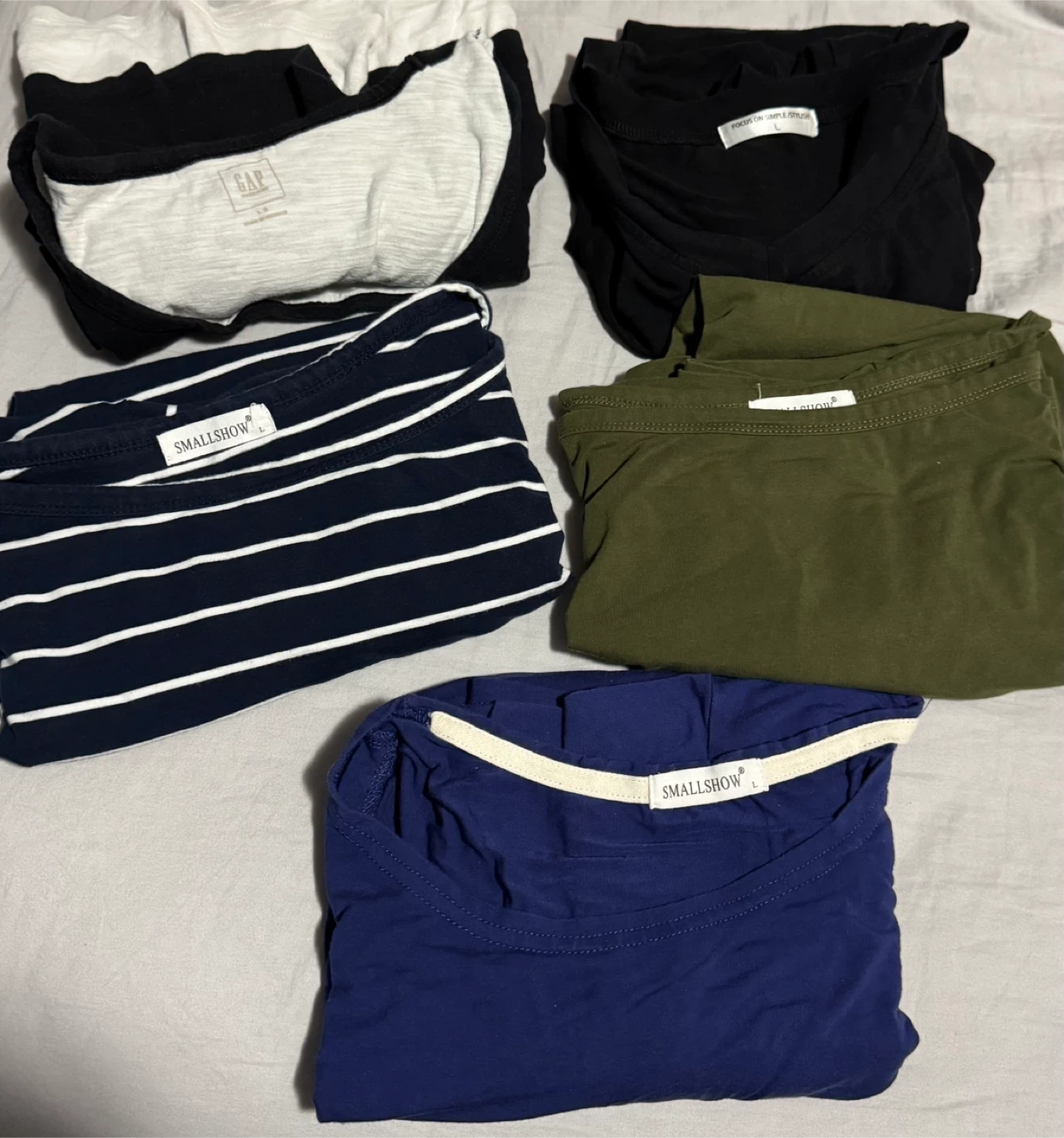 Selling a bundle of five women's t-shirts in size L. Includes brands like Gap, Smallshow, and Focus on Simple Muse. Great for everyday wear!