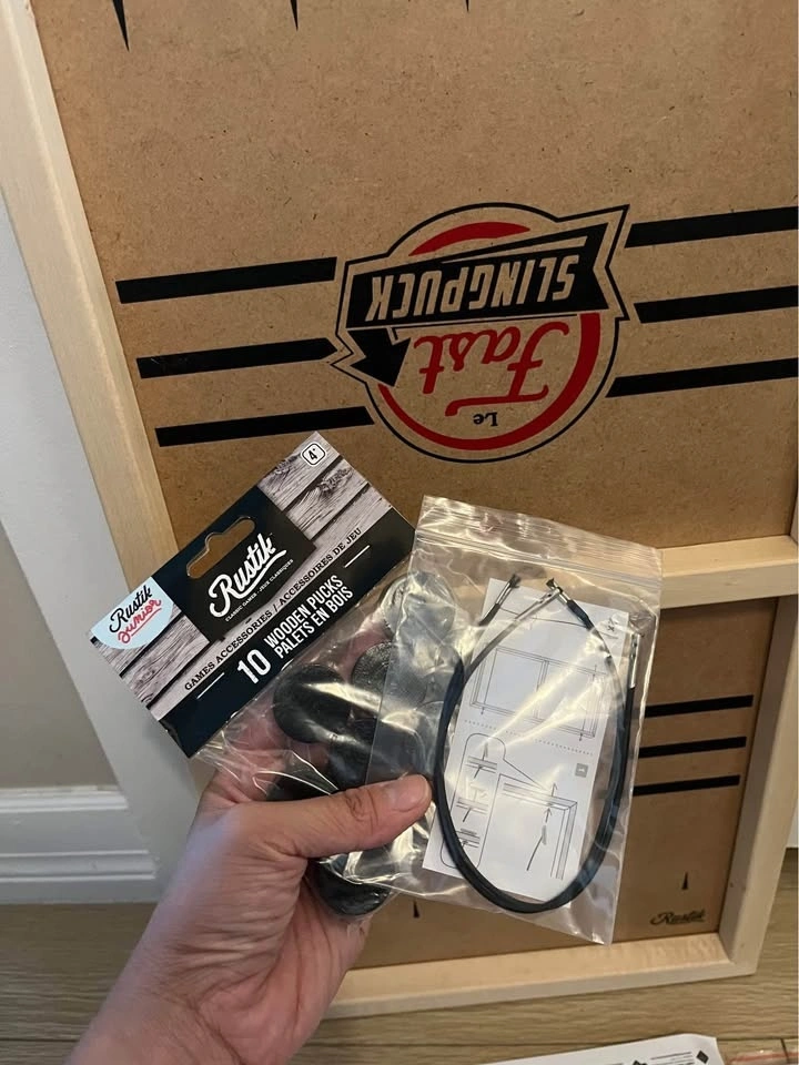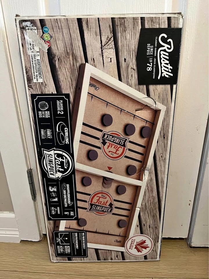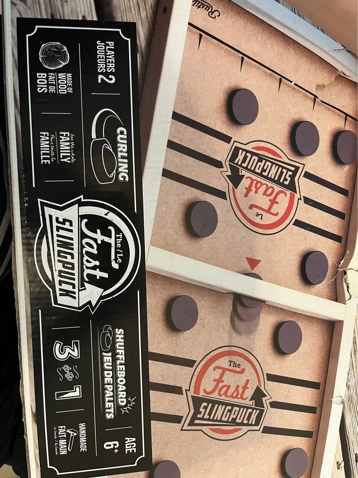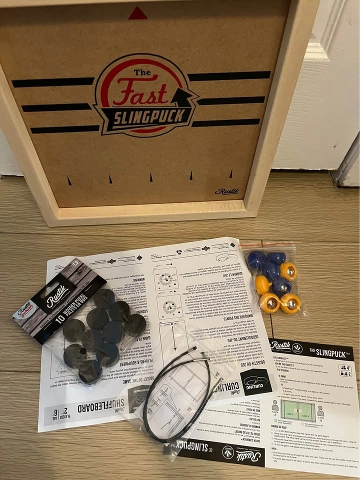 One side of the board has rustic slingpuck, where players earn points by using the elastic band to fling their chips through the opening to the other side. The other side of the board features curling and shuffleboard, where players flick and slide the colored stones into position to earn points!