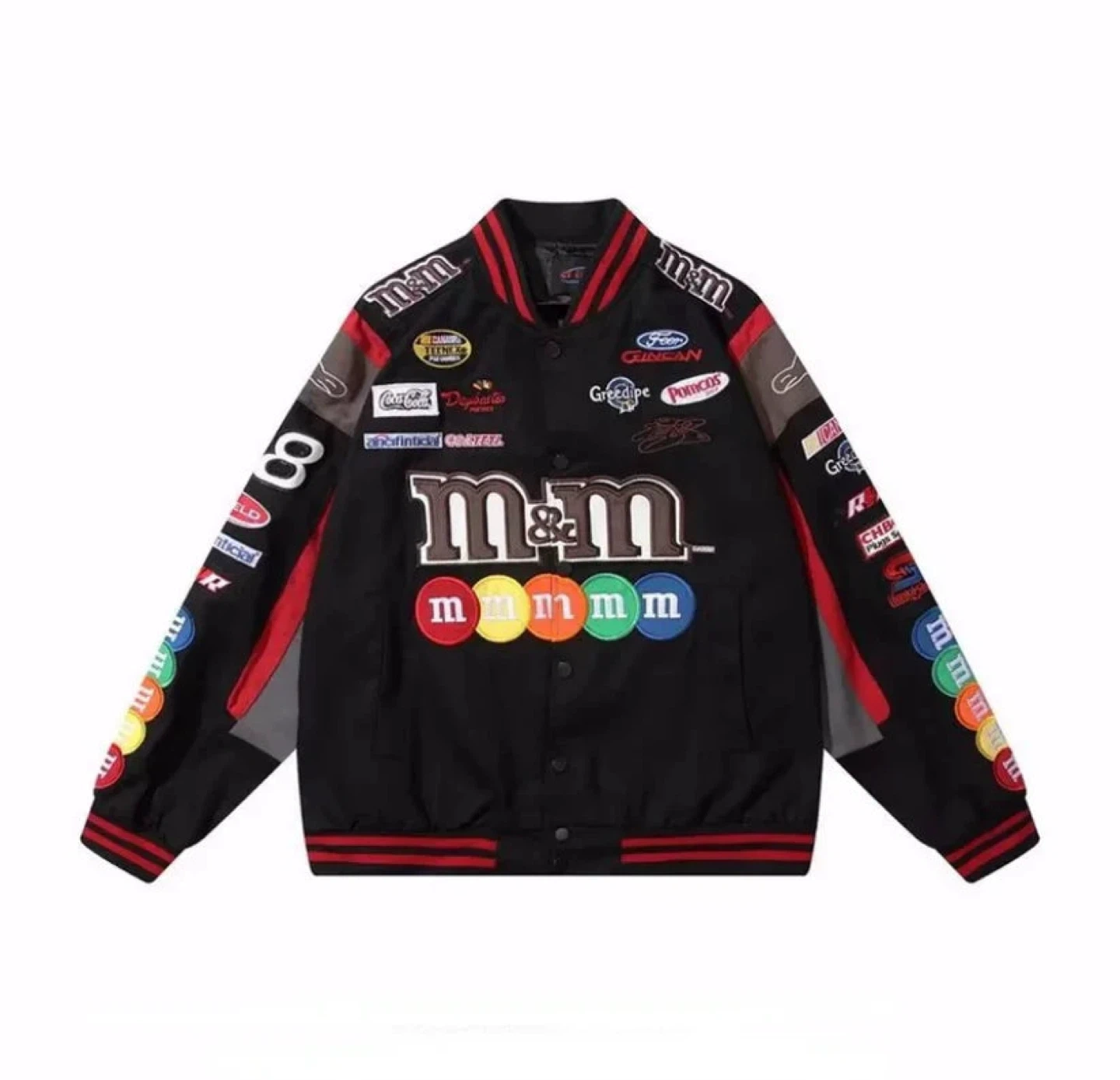 Selling this unique M&M's racing jacket! It's got a bunch of cool patches and logos, including M&M's, Coca-Cola, Ford, and more. A real statement piece!