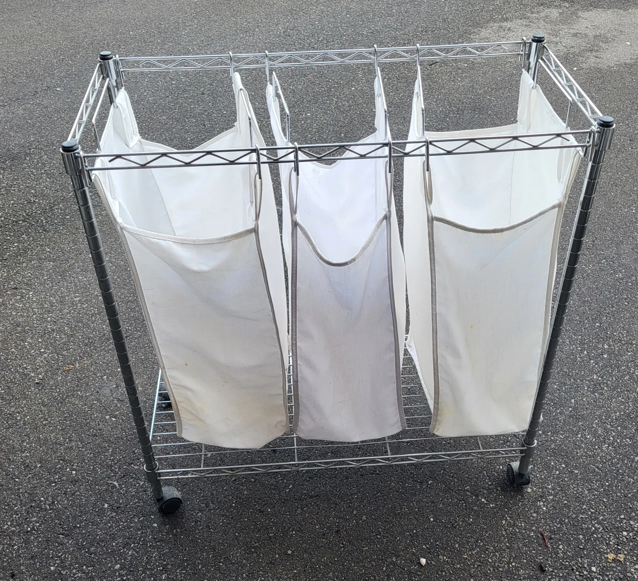 Laundry sorter with three compartments and wheels for easy moving around. Great for keeping your whites, darks, and colours separate!