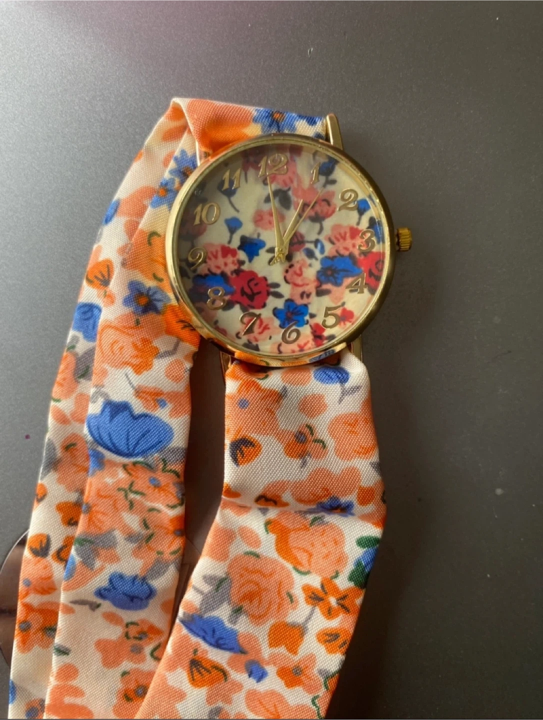 Cute floral print watch with a gold-tone bezel and a matching floral print band. It's in great condition and ready to add a pop of colour to your outfit