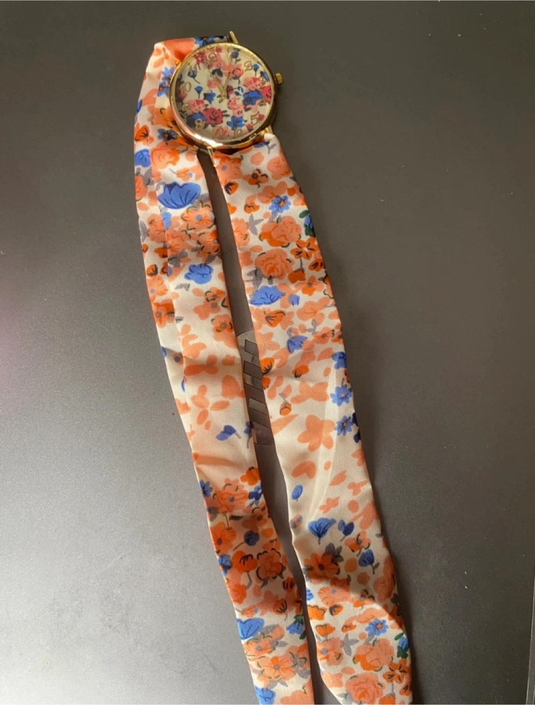 Cute floral print watch with a gold-tone bezel and a matching floral print band. It's in great condition and ready to add a pop of colour to your outfit