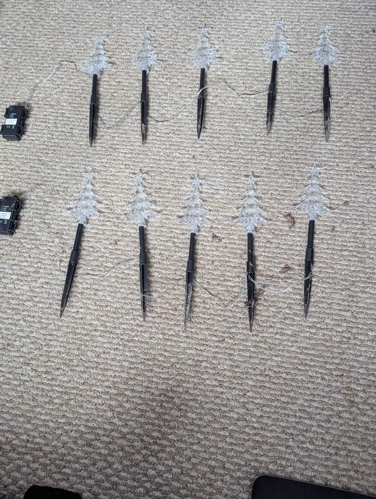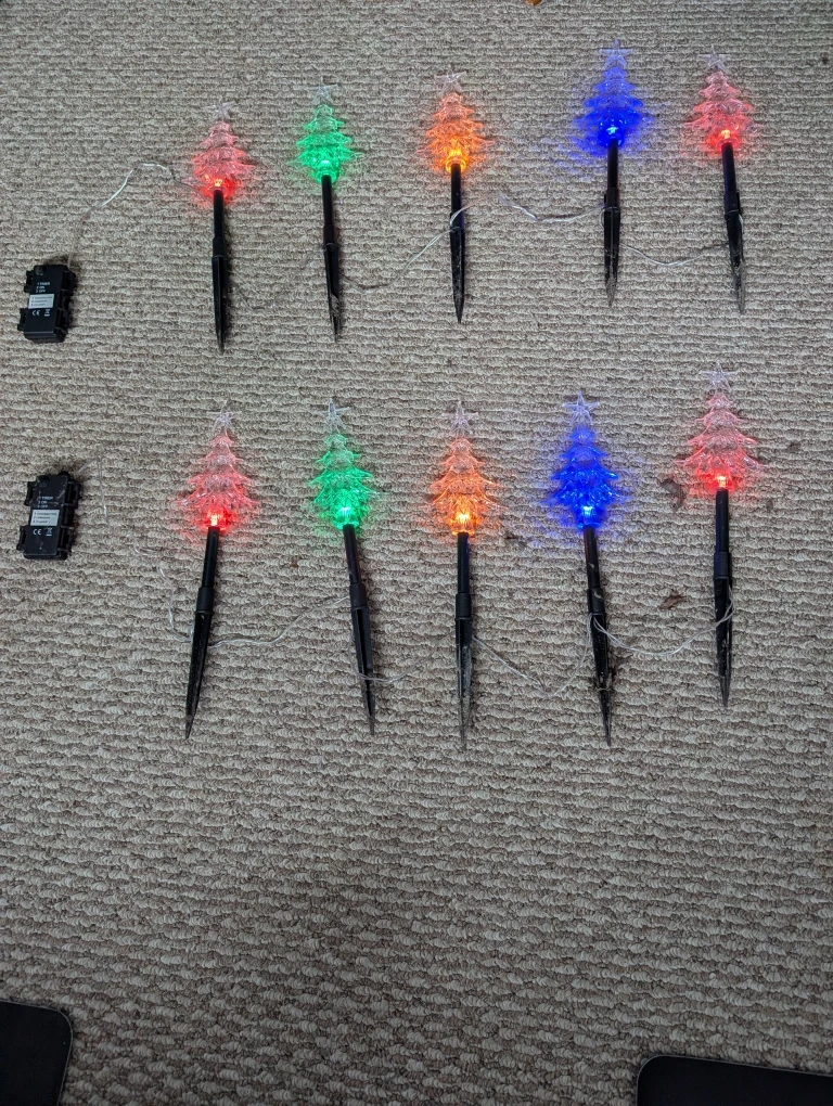 set of 10 Christmas tree lawn lights! They're perfect for adding a festive touch to your outdoor space during the holidays. They light up in different colours.