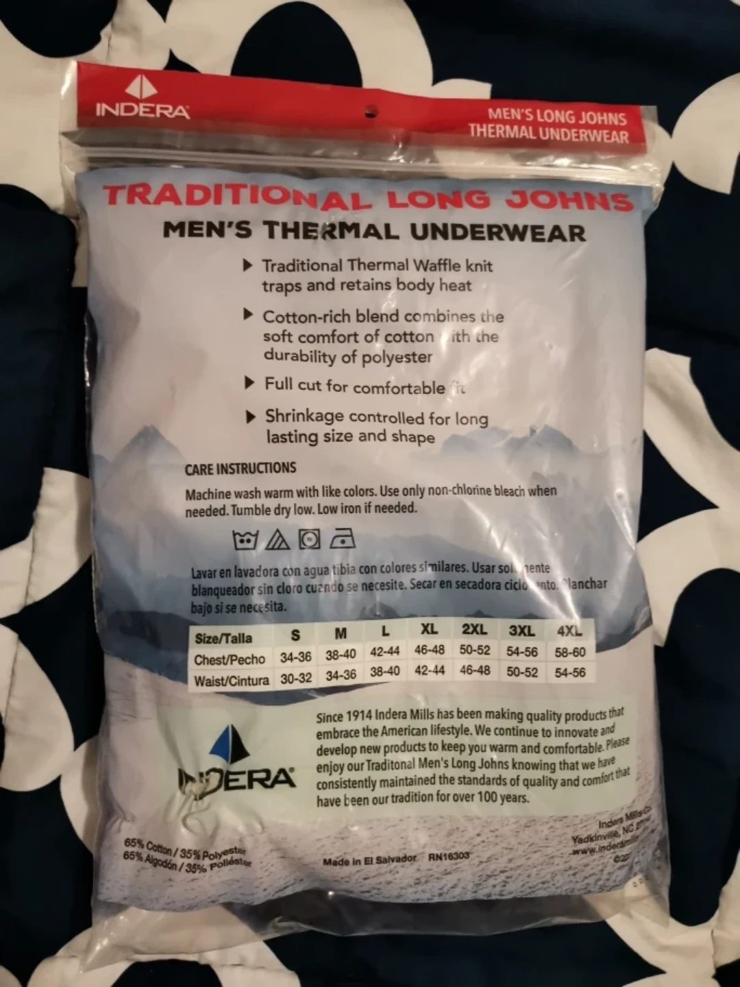Selling a brand new pair of Indera Men's Thermal Long Johns! These are size 2X (46-48). They're made of 65% cotton and 35% polyester for a comfortable fit. These traditional waffle knit traps and retains body heat. The soft cotton-rich blend combines the comfort of cotton with the durability of polyester. Full cut for comfortable fit, shrinkage controlled for long lasting size and shape