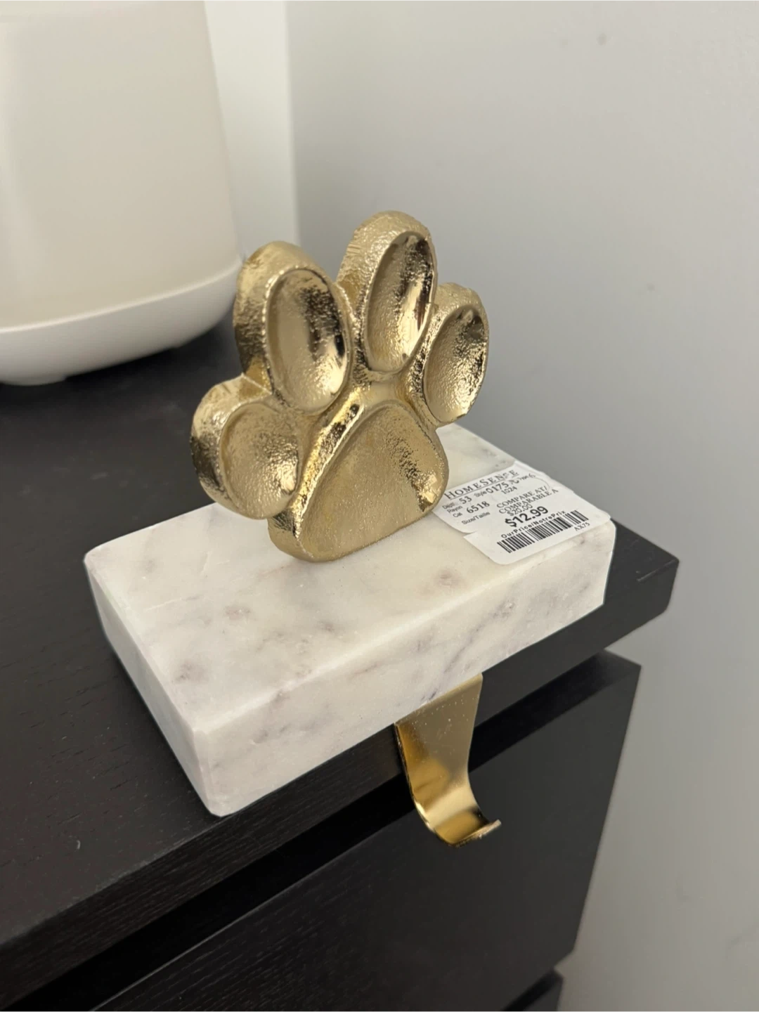 Selling a cute HomeSense stocking holder! It features a gold paw print on a white marble base. Perfect for adding a touch of charm to your holiday decor. The original price was $12.99