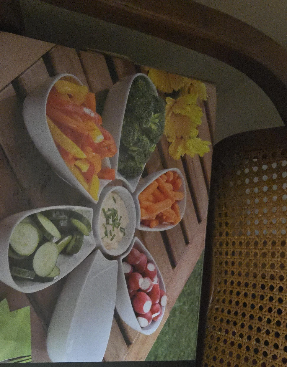 This is a white ceramic snack server shaped like a flower! It's perfect for serving veggies and dip for a party or just a snack for yourself