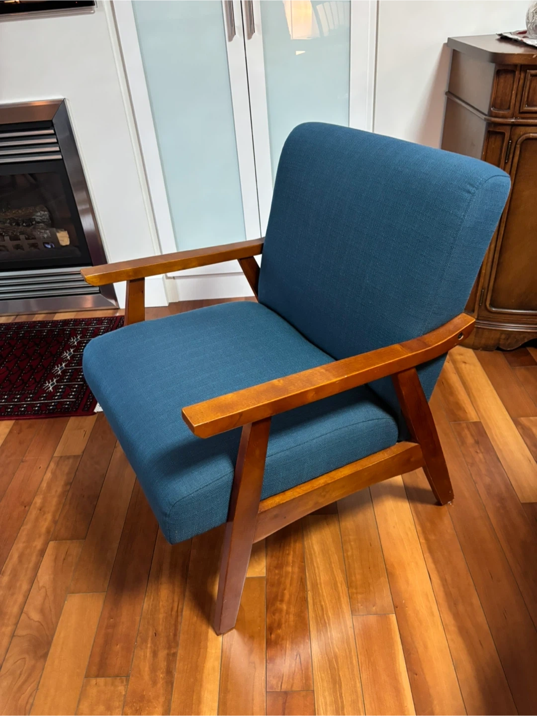 Stylish blue armchair that would look great in any living room or study! It's in good condition and ready for a new home. The wood frame is sturdy and the blue fabric is comfortable and easy to clean