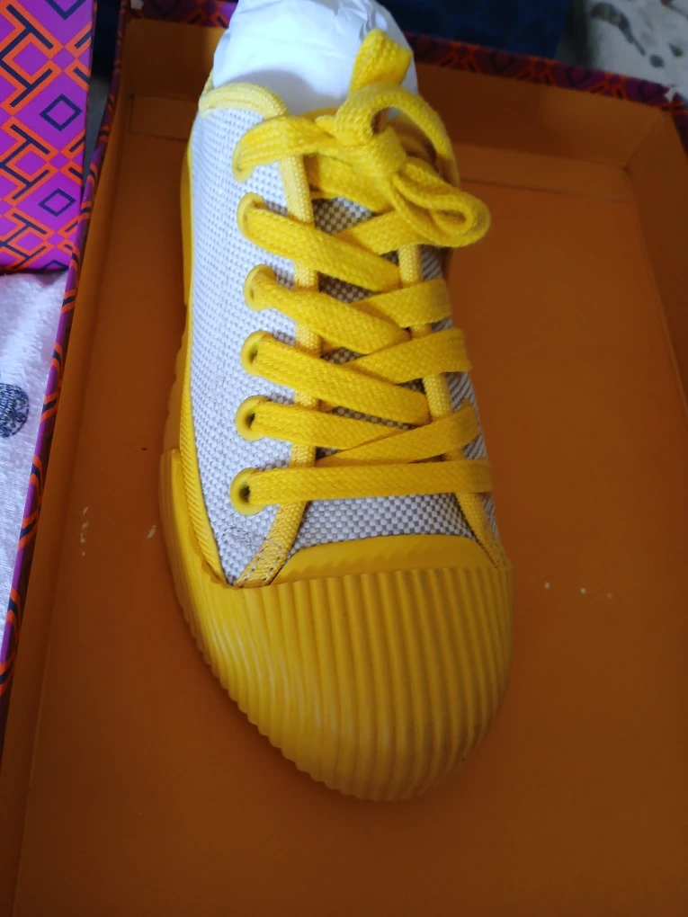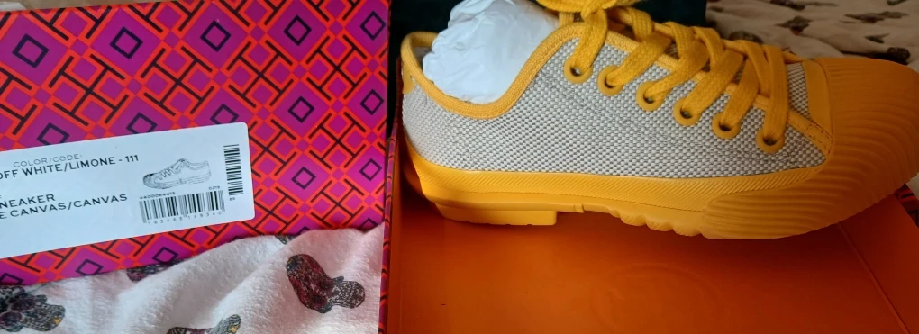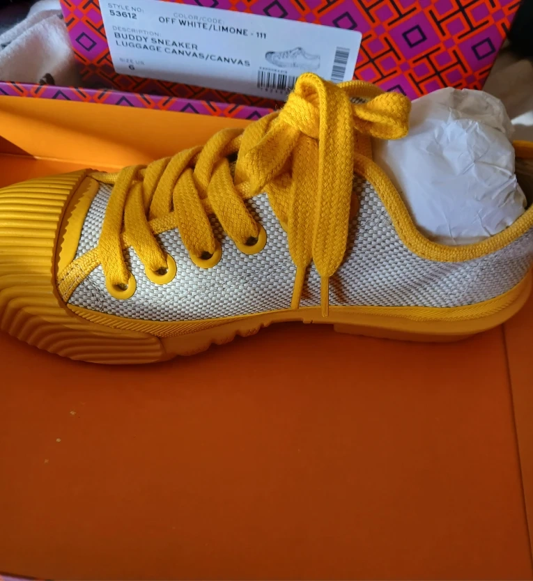 These Tory Burch Buddy sneakers are brand new and ready for a new adventure! They come in the Off White/Limone colorway and are a US size 6. The sneakers are made with a lineage canvas/canvas material and come with the original box.