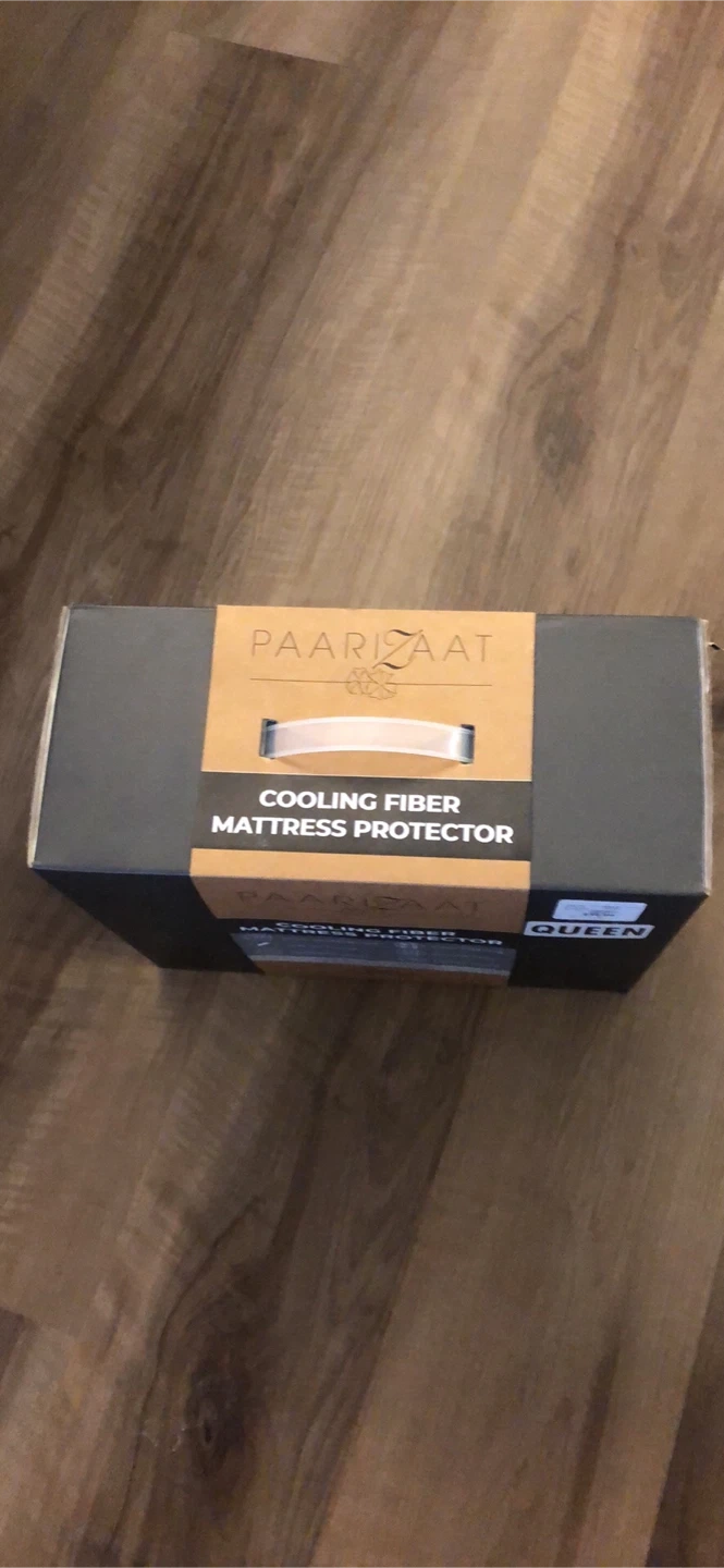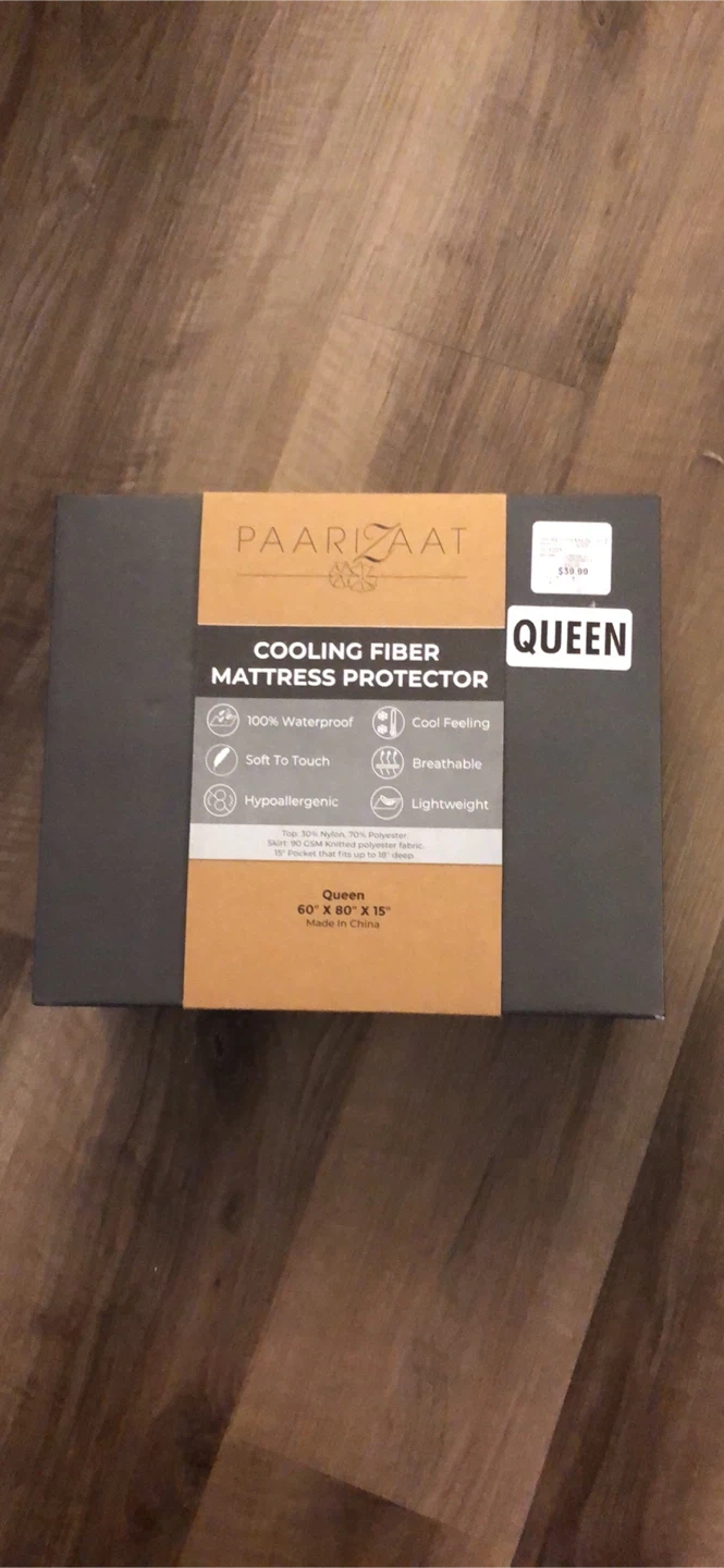 Selling a Paarizaat cooling fibre mattress protector, brand new in box! This is a queen size mattress protector. It's 100% waterproof, soft to the touch, and breathable. It also has a cool feeling and is hypoallergenic and lightweight. The box indicates it fits mattresses 60" x 80" x 15".