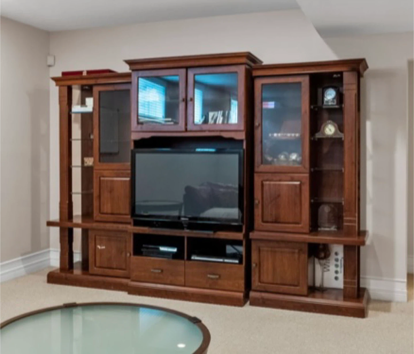 Selling a large wooden entertainment unit. It features glass door cabinets and shelving for displaying items. A great piece for any living room or entertainment space!