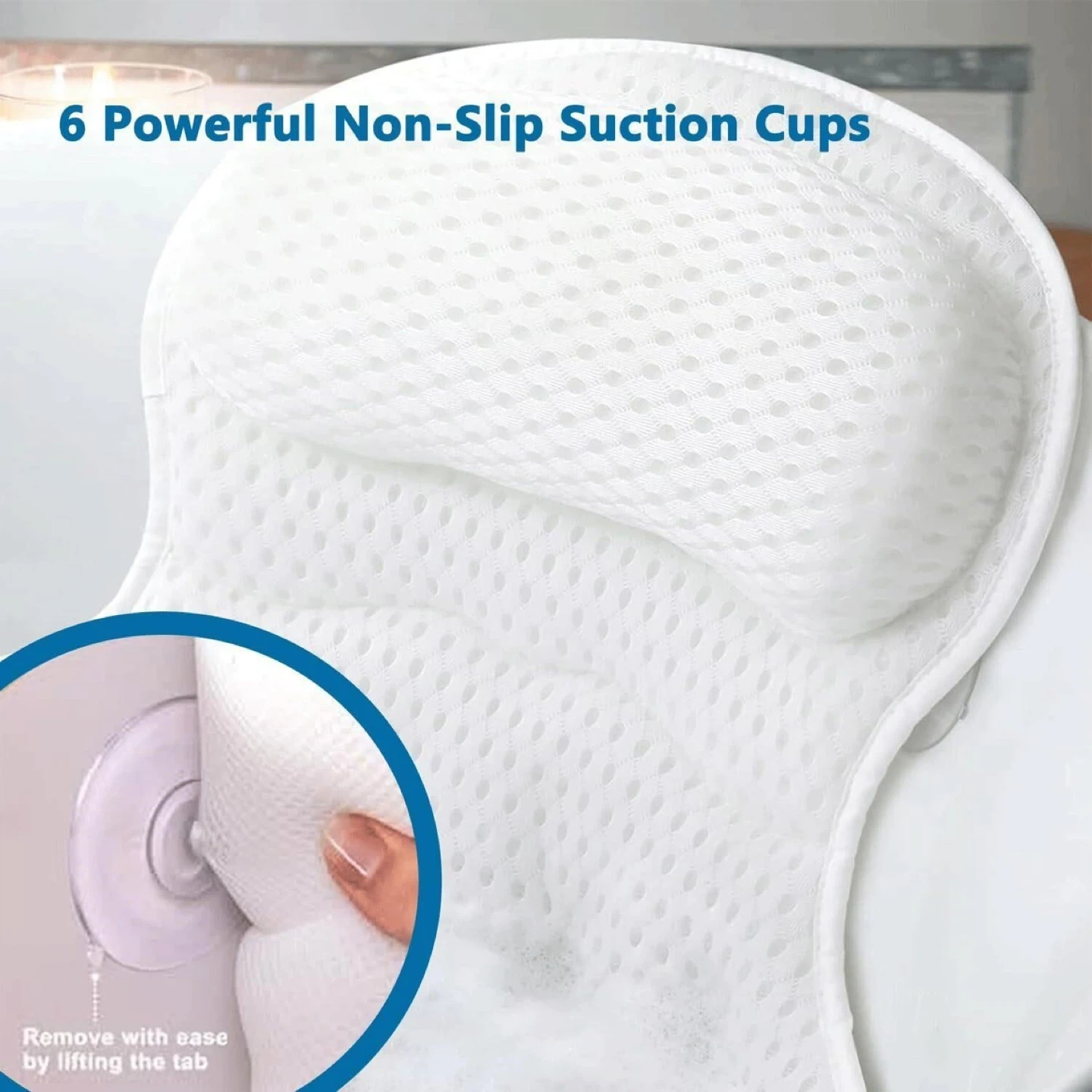 Relax in the tub with this XYORA bath pillow! It's made with upgraded 4D air-mesh fabric, so it's extra soft, comfortable, and breathable. It also dries quickly and is supportive. It measures 17" x 17" and features 6 powerful non-slip suction cups
