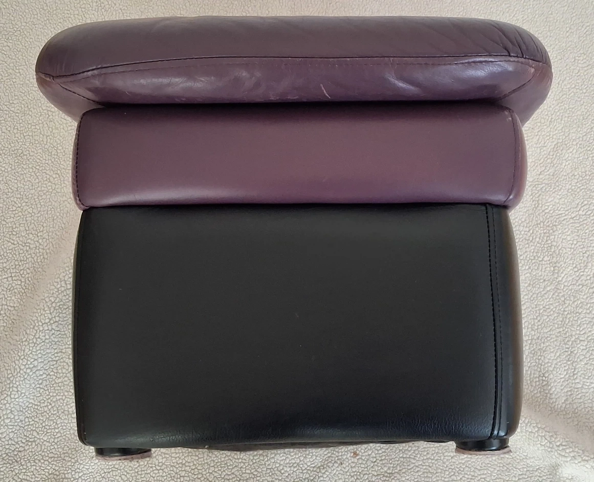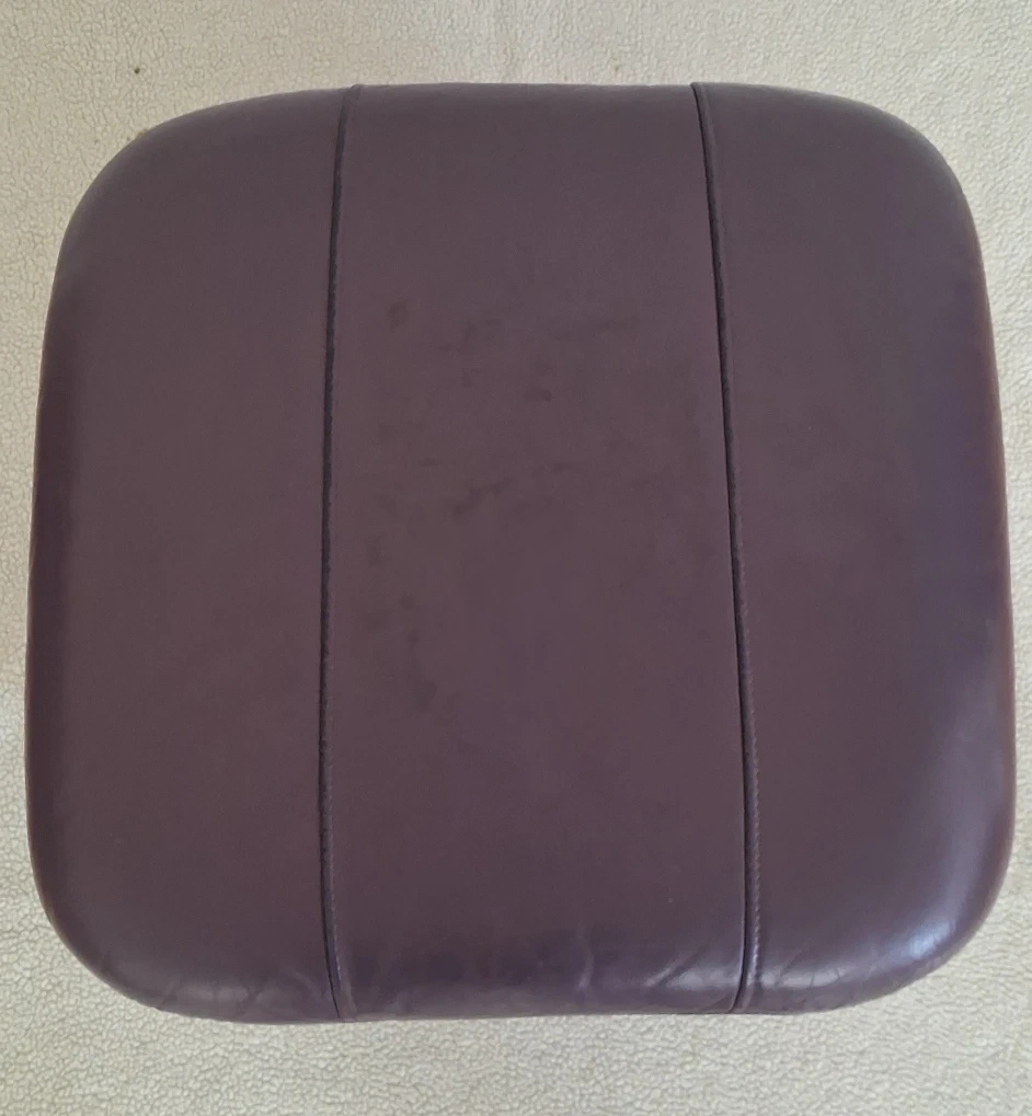 A comfy leather ottoman footstool that's perfect for kicking back and relaxing! It features a purple top and a black base.