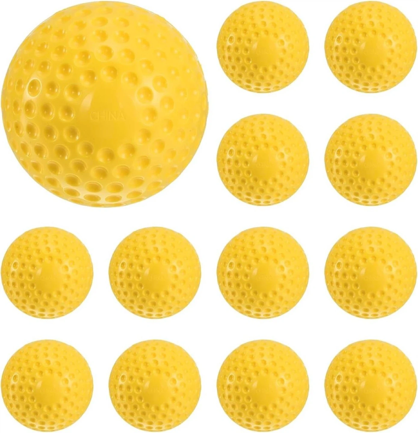 Selling a set of 9 pitching machine softballs in a bright yellow colour. Each ball is 12 inches in diameter and weighs 188g (6.5 oz). They feature regular indentations for a non-slip grip and are made of durable PU to withstand hitting. Great visibility for hitting!
