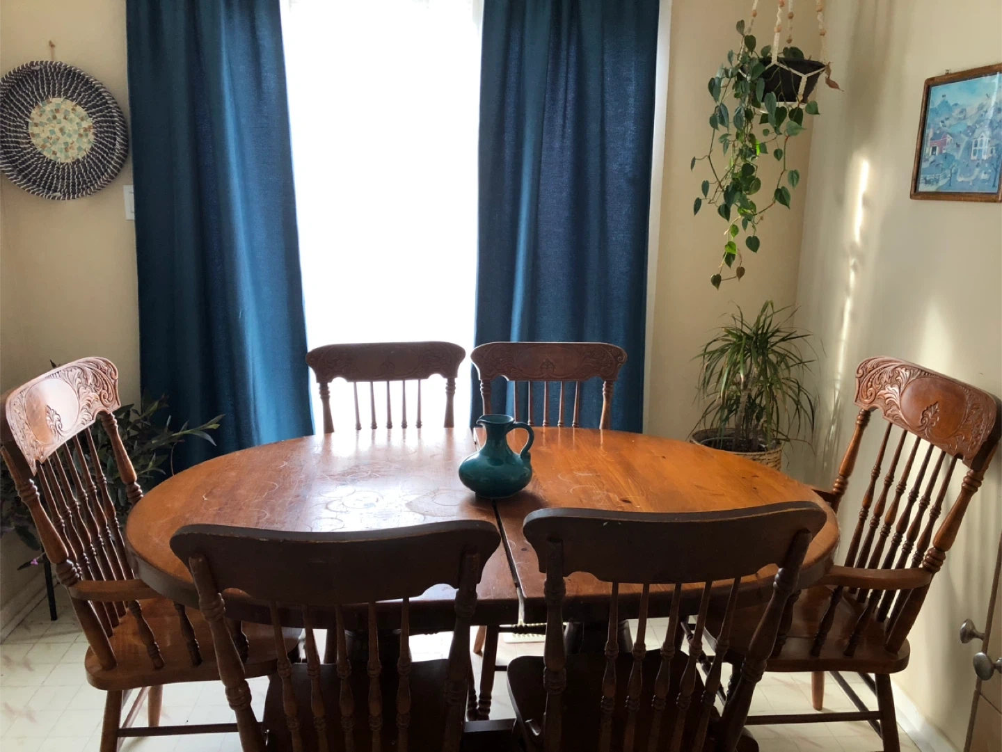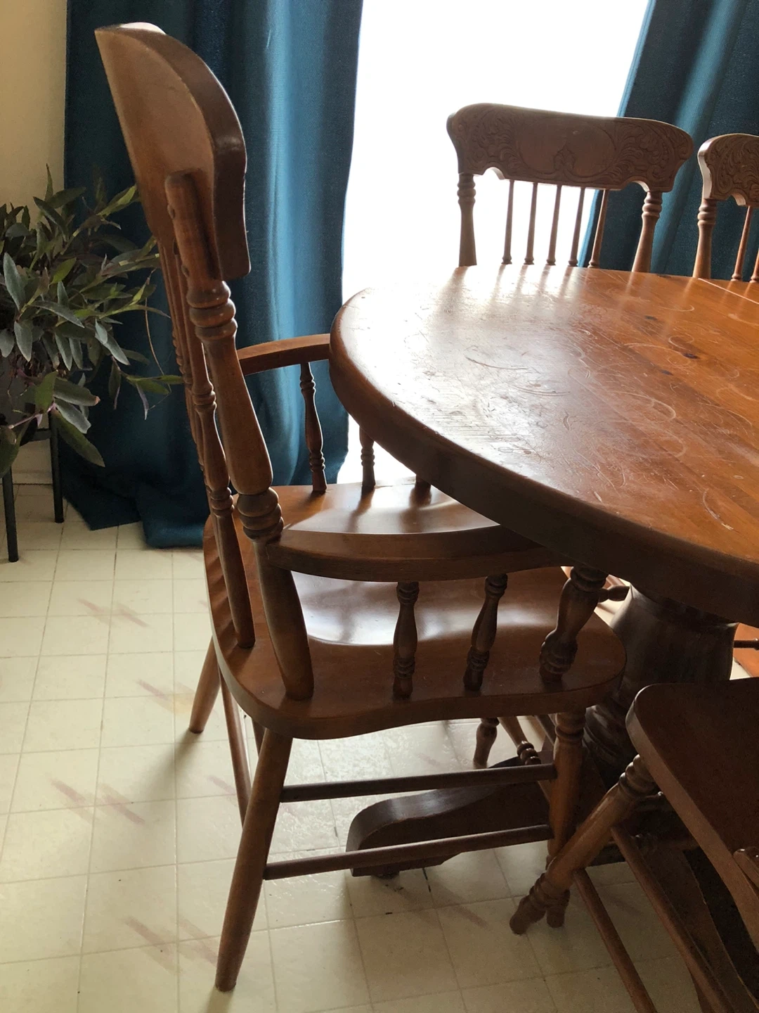 Selling a wood dining table with six chairs. It's a great set for family dinners or hosting friends. The table has some wear and tear, but is still sturdy and functional. The chairs are all in good condition and match the table nicely. Perfect for a dining room or kitchen space!