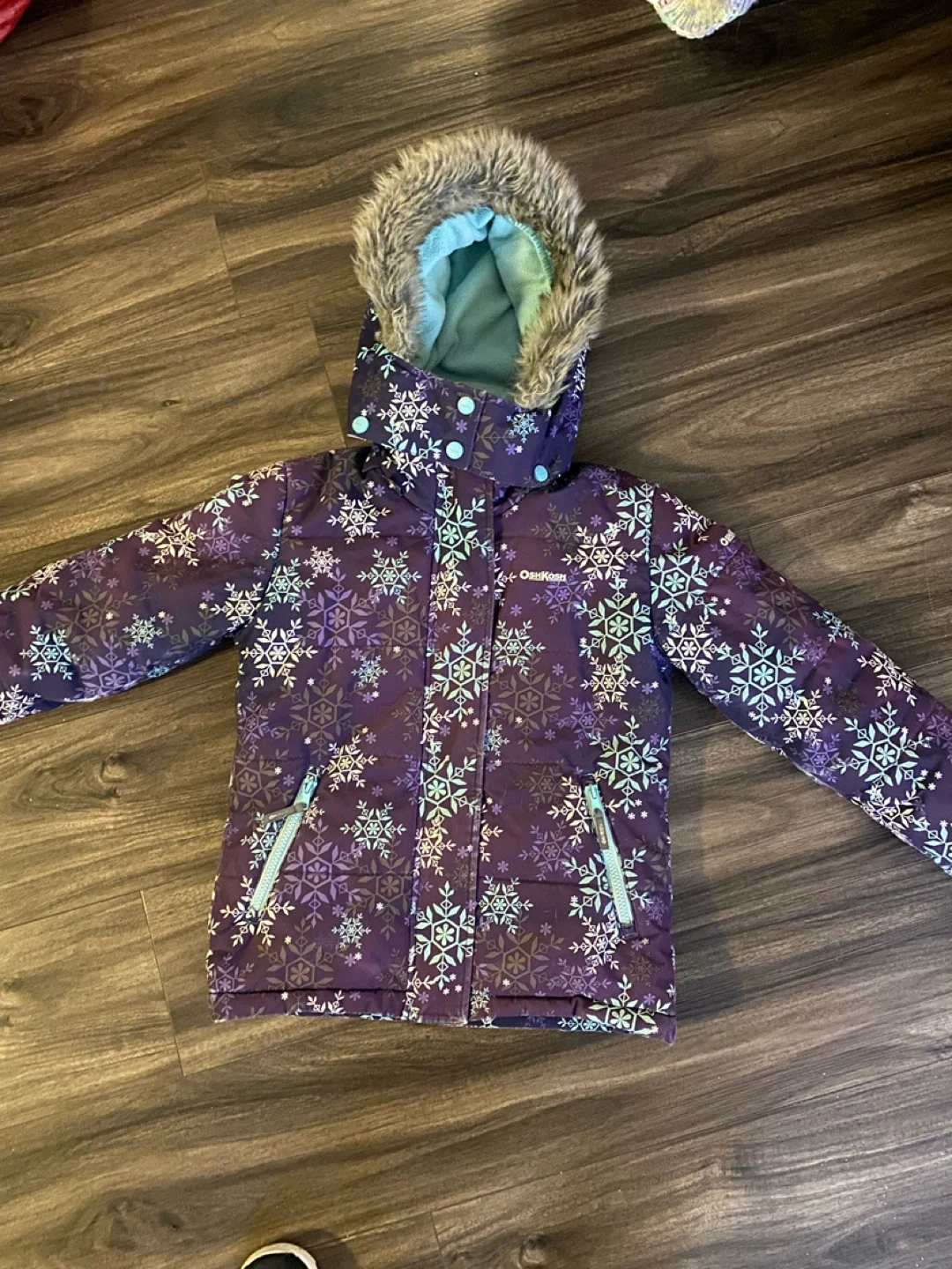 Here's a cute OshKosh B'gosh winter jacket in a size 7! It features a fun snowflake pattern and a faux fur-trimmed hood to keep your little one warm and cozy during the colder months