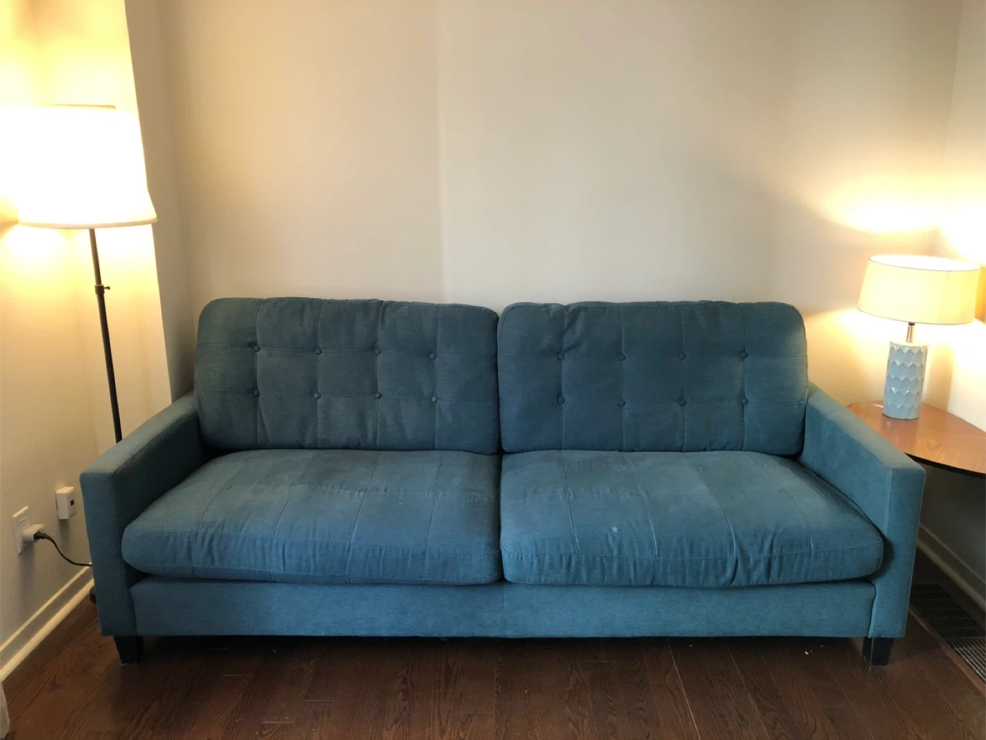 Selling a comfy blue sofa! (The Brick) It's in good shape and would look lovely in any living room. The colour is a nice, calming blue. It's a great piece of furniture for relaxing and unwinding after a long day