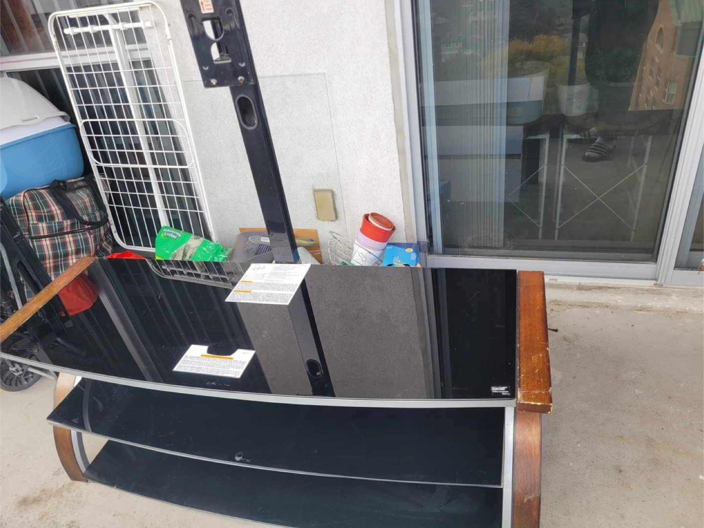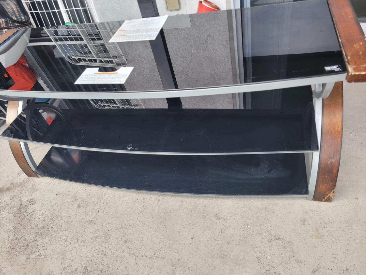 Selling a stylish black glass TV stand! It features sleek glass shelves and elegant wooden accents. Perfect for adding a touch of modern sophistication to your living room or entertainment area. The stand is in good condition and ready to hold your TV and media devices