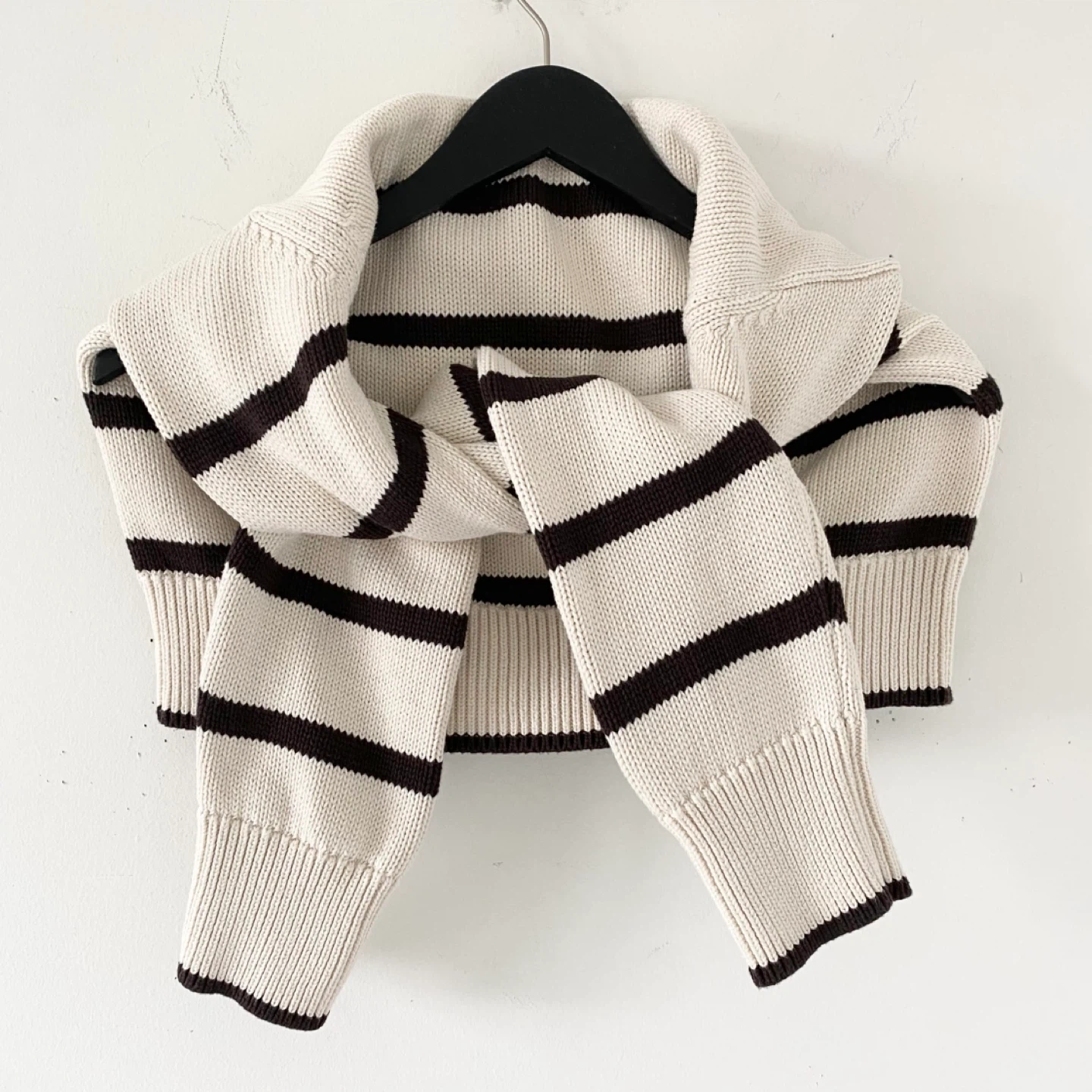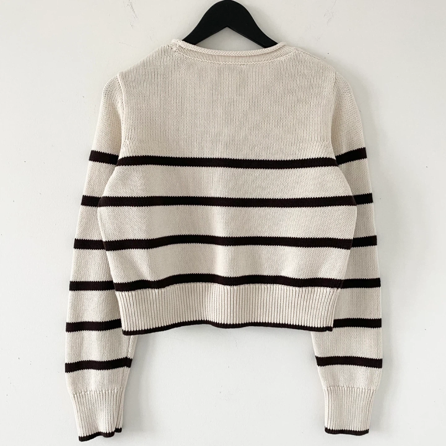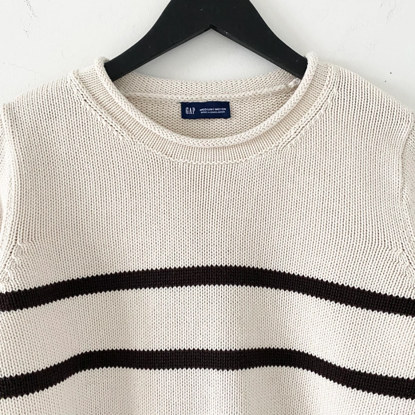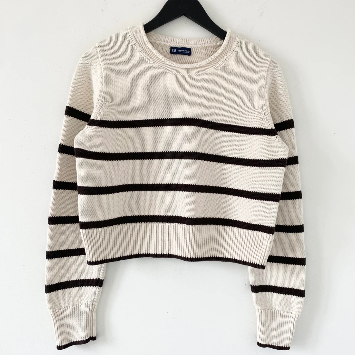 GAP roll neck slightly cropped (hem should sit at the waist) sweater. Made of medium weight 100% cotton in cream and brown stripes. There's no staining, pilling or damage. It's clean and in excellent condition / like new.