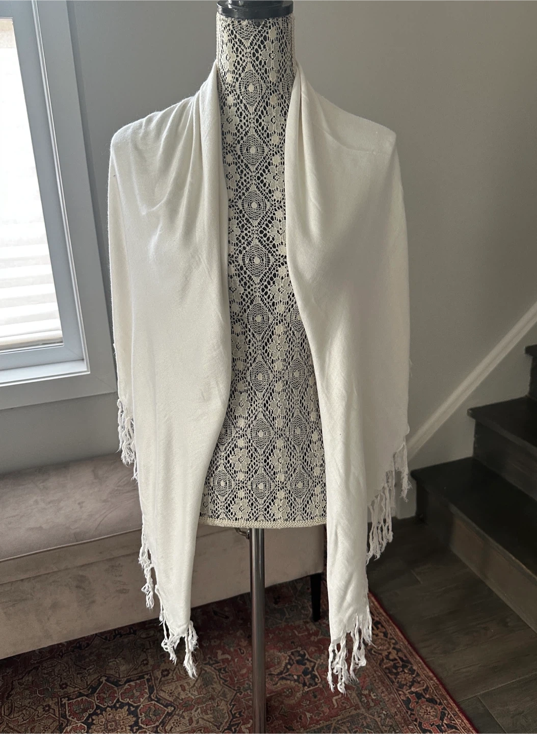 Here's a lovely white shawl! It has a nice soft texture and cute tassels along the edges. It's perfect for adding a touch of elegance to any outfit or keeping you cozy on a cool evening New, never worn - moving $1 Fastest pick up