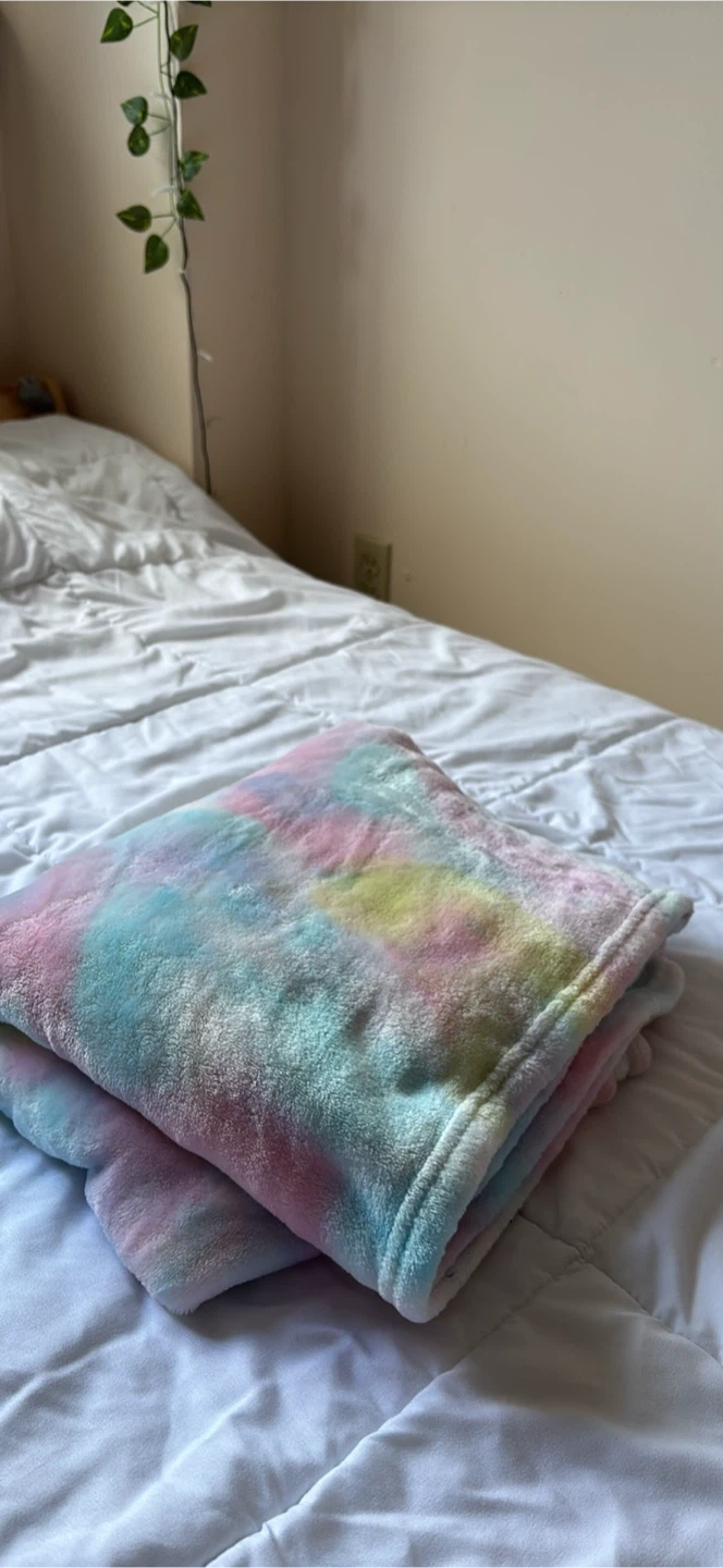 New, just dusty for not being used! Here's a super soft and cozy plush blanket! It features a fun tie-dye pattern with pastel colours. Perfect for snuggling up on the couch or adding a pop of colour to your bedroom.