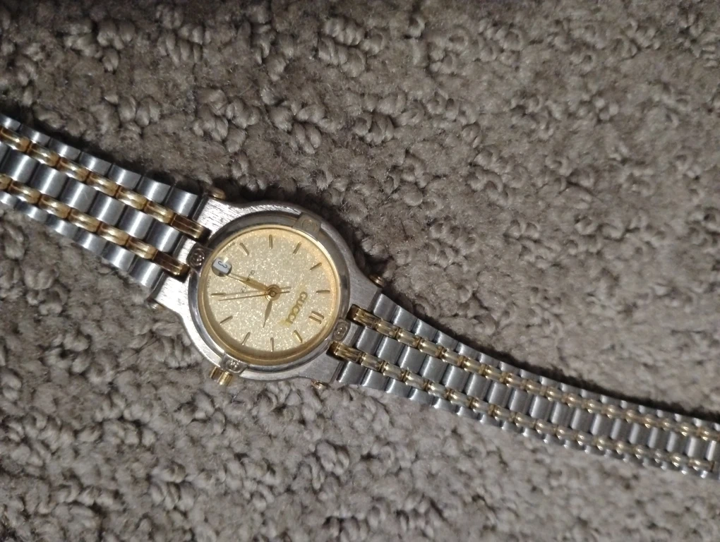 Selling a Gucci ladies watch in a two-tone silver and gold colour. It's a quartz watch with a date display. The watch shows some signs of wear.