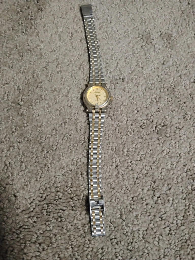 Selling a Gucci ladies watch in a two-tone silver and gold colour. It's a quartz watch with a date display. The watch shows some signs of wear.