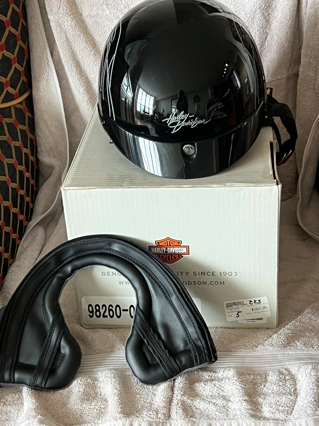 Harley-Davidson helmet in size XXS! It comes with the box and included components. The helmet is black with a white design. The box has the model number 98260-07V/022S. Originally bought for $167.95
