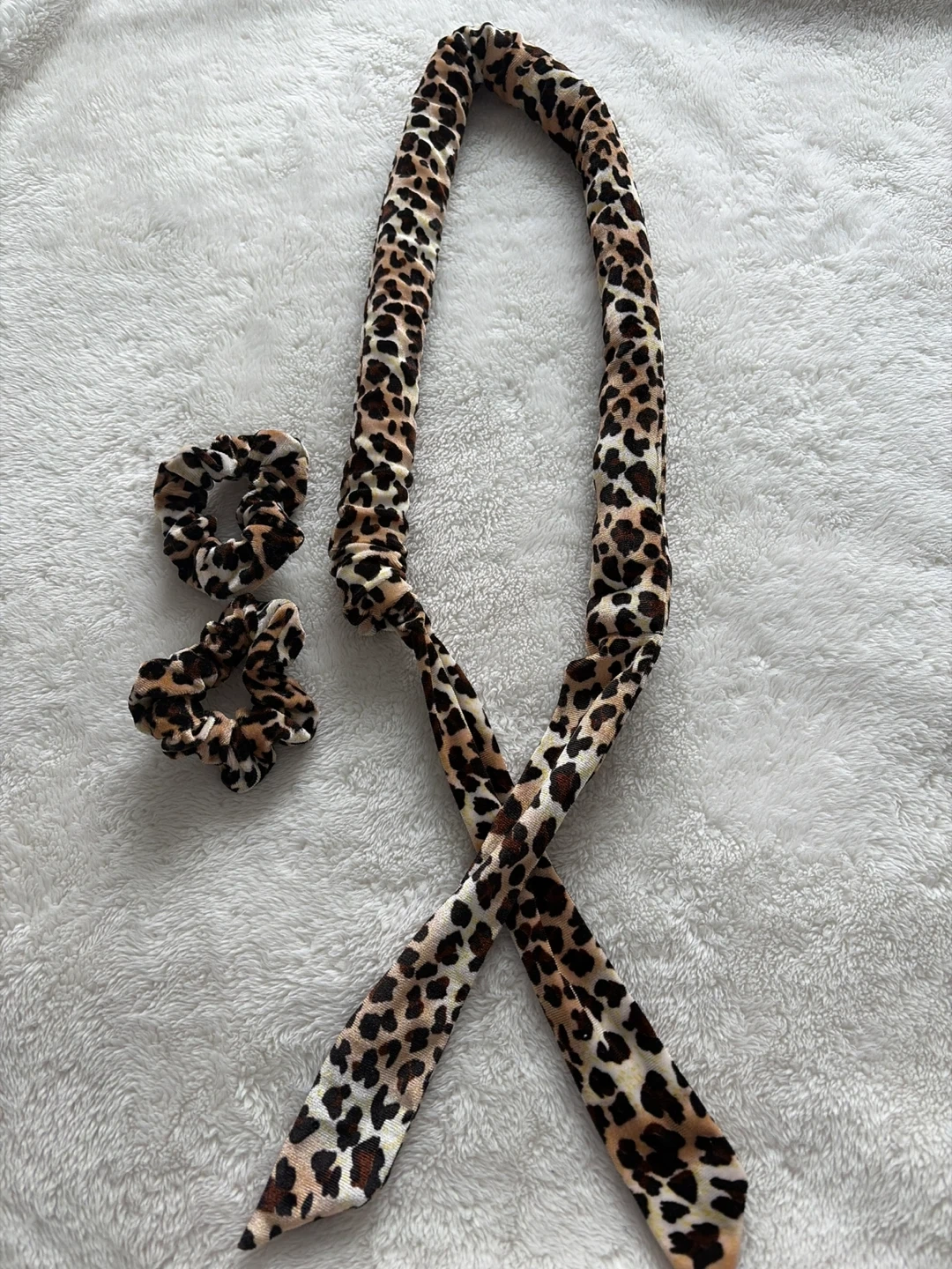 Selling a cute leopard print hair curler set! It comes with the curler and two matching scrunchies. Perfect for creating heatless curls and waves. The set is in great condition and ready for a new owner!