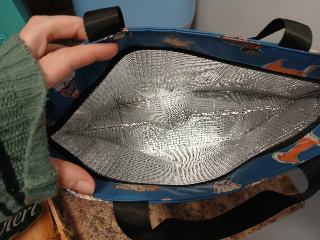 This is a cute insulated lunch tote bag with a dog print. It features a zipper closure and black straps. Perfect for keeping your lunch cool!