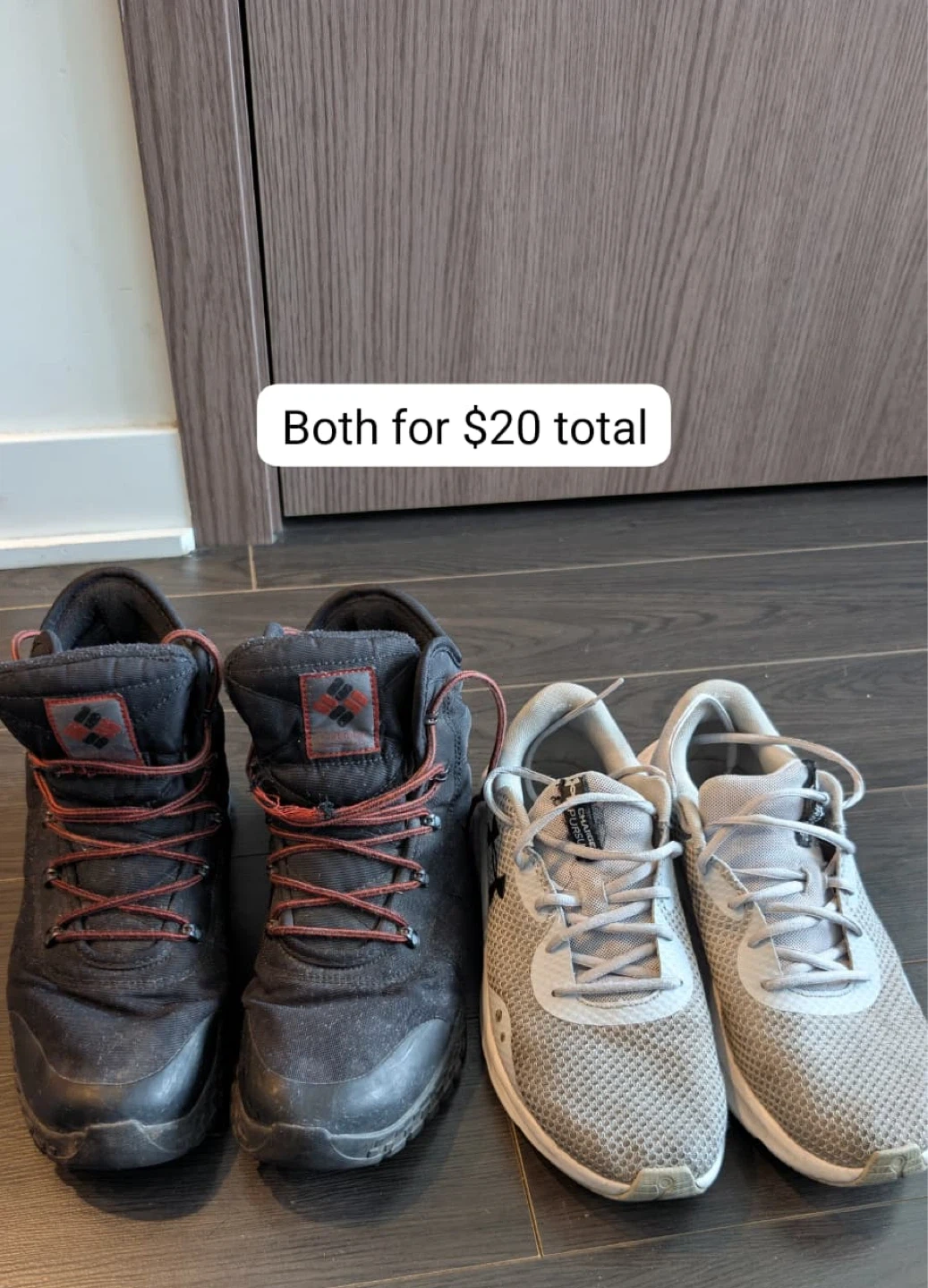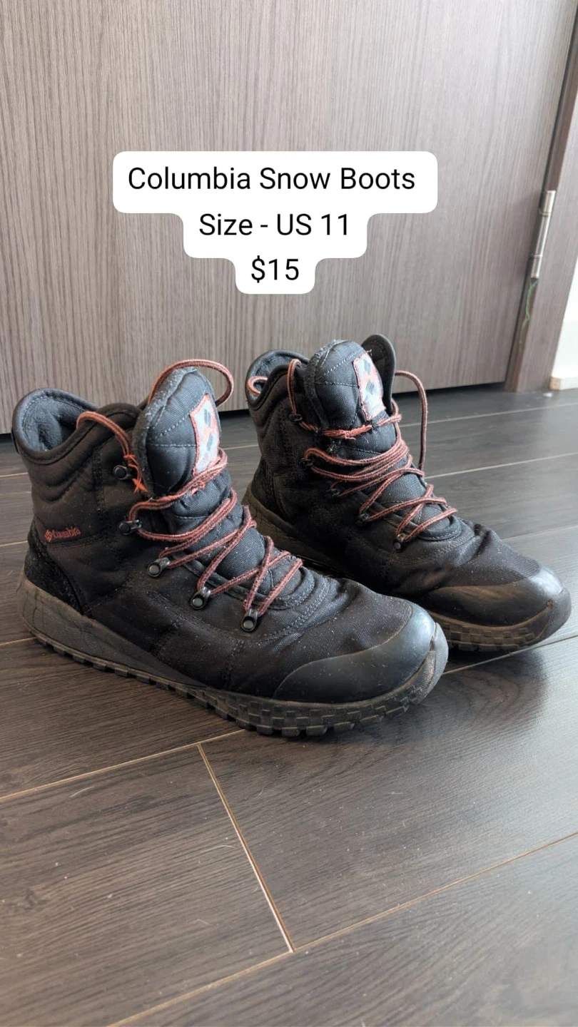 Selling a pair of Columbia snow boots in US size 11 and Under Armour running shoes in US size 11.5. Both for $20