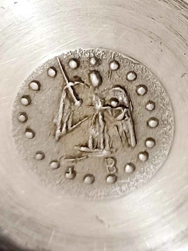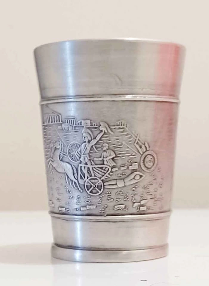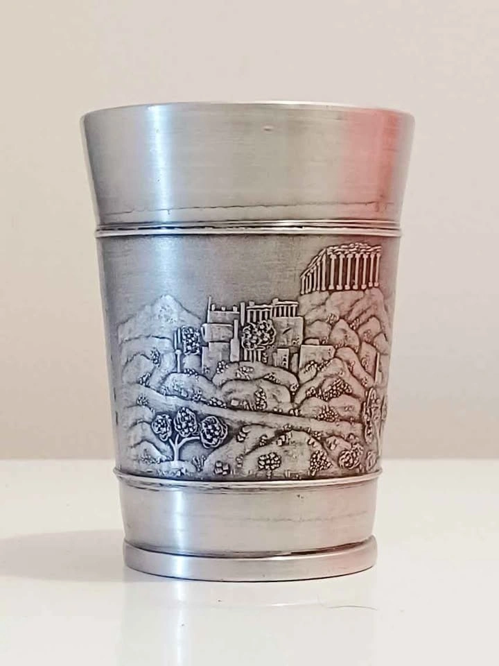 Unique Vintage, Very Rare, Bottom Stamped, Pewter goblet adorned with detailed Engravings of historical ancient Greek scenes and architecture. It has a sturdy base and a comfortable rim for easy handling. The bottom features a unique emblem, adding to its collectible appeal