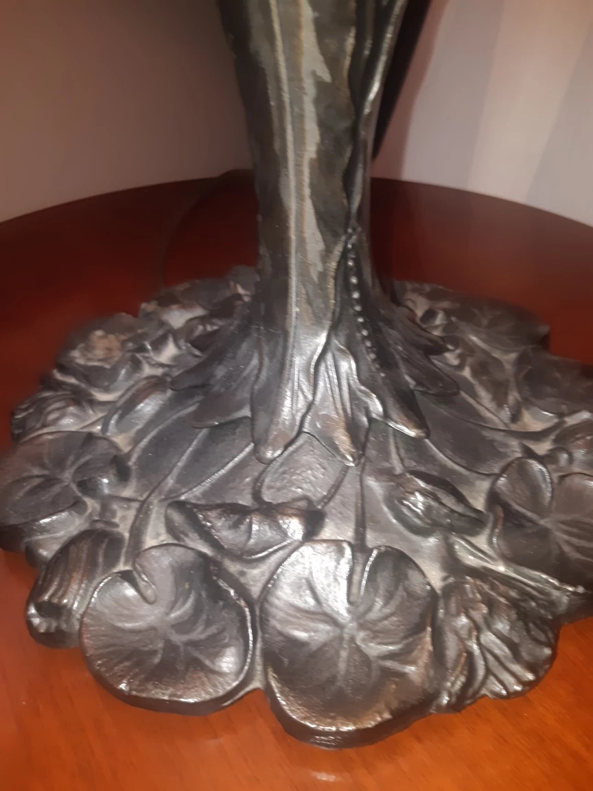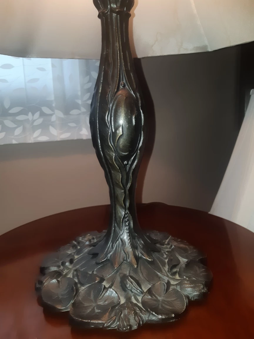 Selling a vintage-style table lamp. It has a unique base with a floral design and a light-coloured lampshade. It would add a touch of elegance to any room!