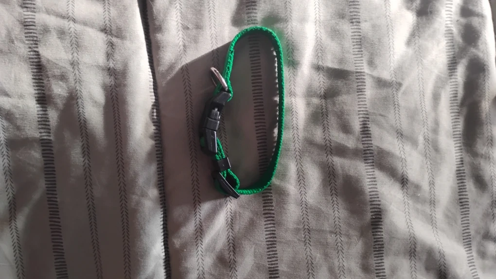Here's a green pet collar up for grabs! It's adjustable to ensure a comfy and secure fit for your furry friend. The collar features a sturdy black buckle and a metal D-ring for leash attachment. Perfect for daily walks and adventures! New for free in dover