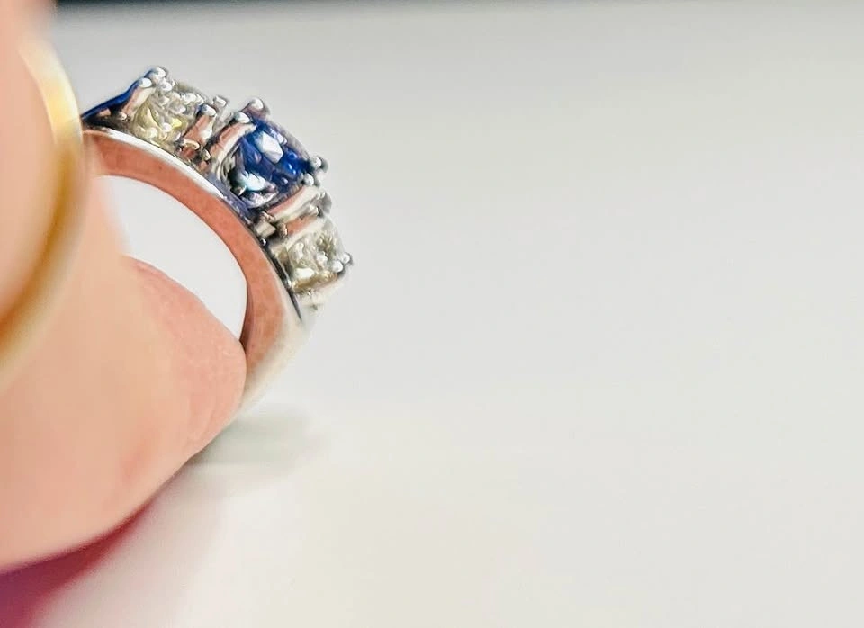 Has been cleaned professionally and Rhodium plated - no scratches or scuffs. It was originally engraved but barely visible after Rhodium plating. It is valued at $14,500.00. All one piece. Women’s Size 5. The ring was custom made with a rare coloured sapphire. There is no other ring like it.