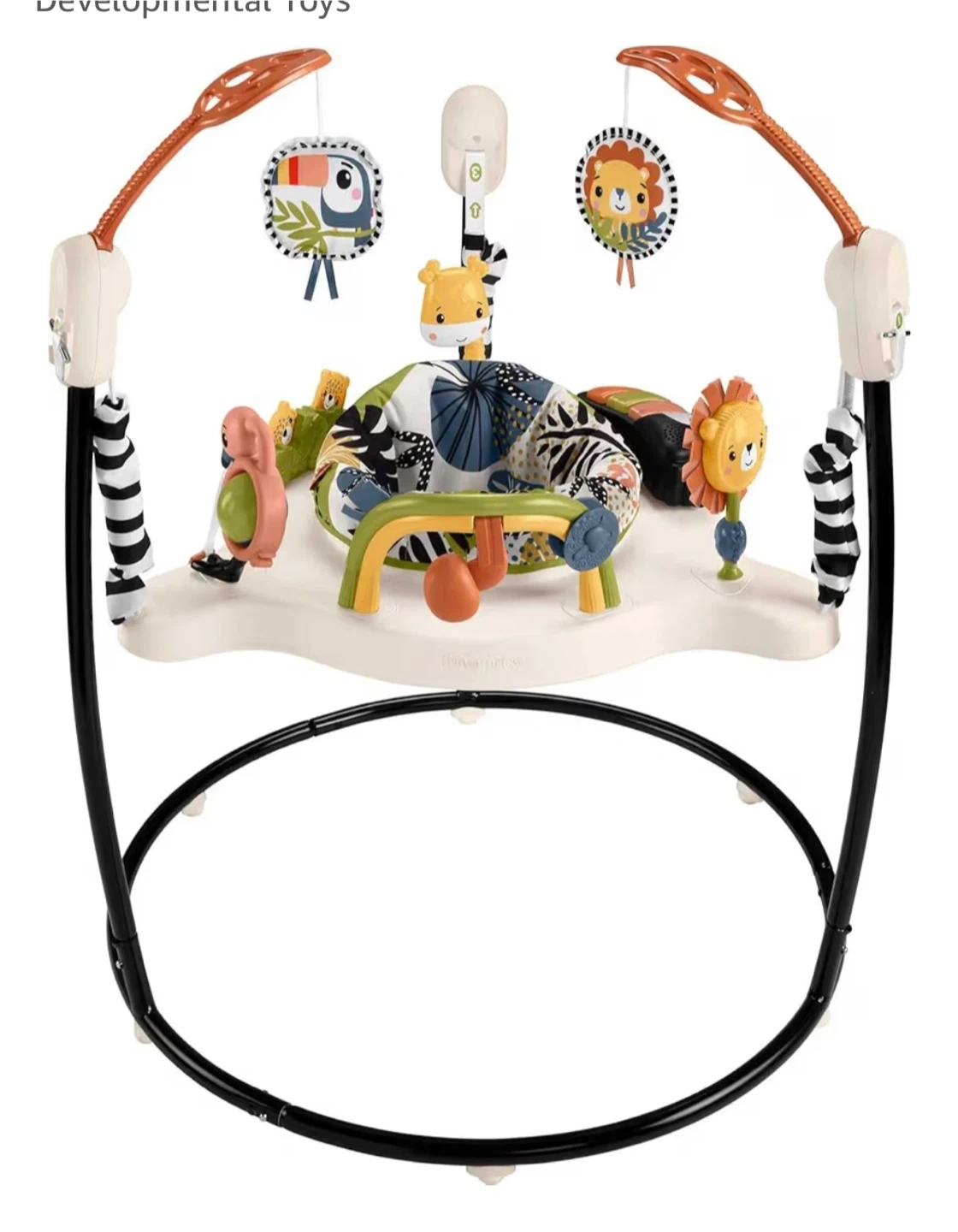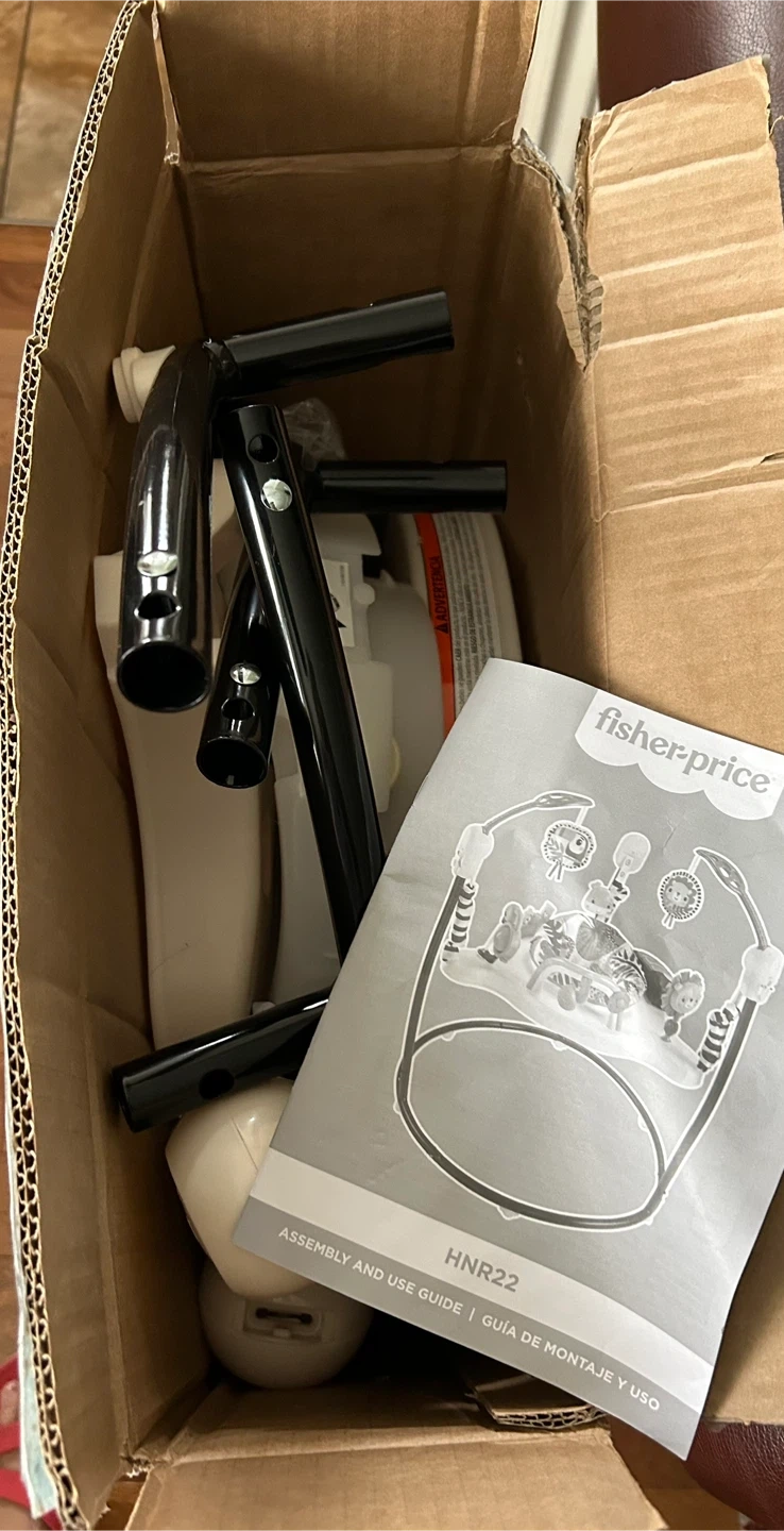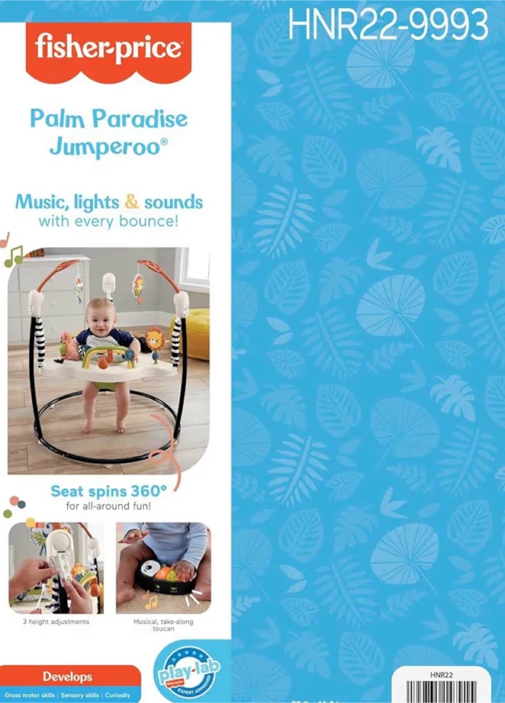 Selling a Fisher-Price Palm Paradise Jumperoo! It's in great condition and ready for a new little one to enjoy. This fun jumperoo features music, lights, and sounds with every bounce. The seat spins 360 degrees for all-around fun! It helps develop motor skills and sensory skills. Comes with the box and assembly/use guide