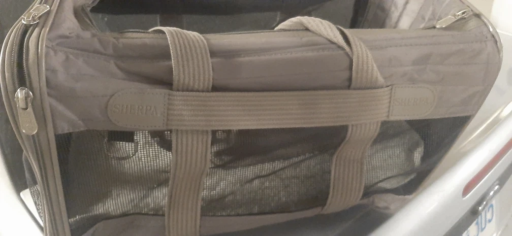 This is a SHERPA pet carrier in great condition! It's a soft-sided carrier, perfect for taking your furry friend on trips or to the vet. The carrier is grey and has mesh windows for ventilation. It also has carrying handles and a shoulder strap for easy transport