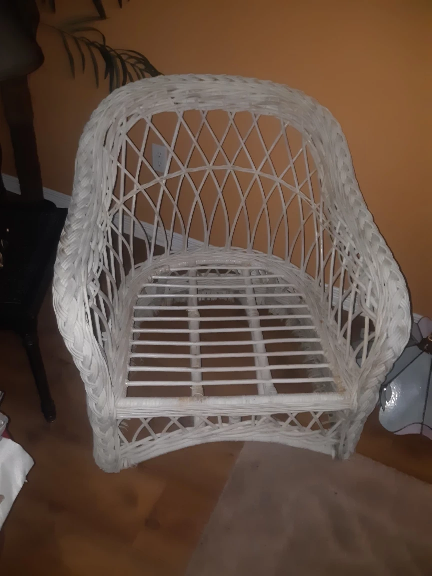 Selling a charming white wicker chair! It comes with a lovely floral cushion, perfect for adding a touch of vintage style to your home or patio