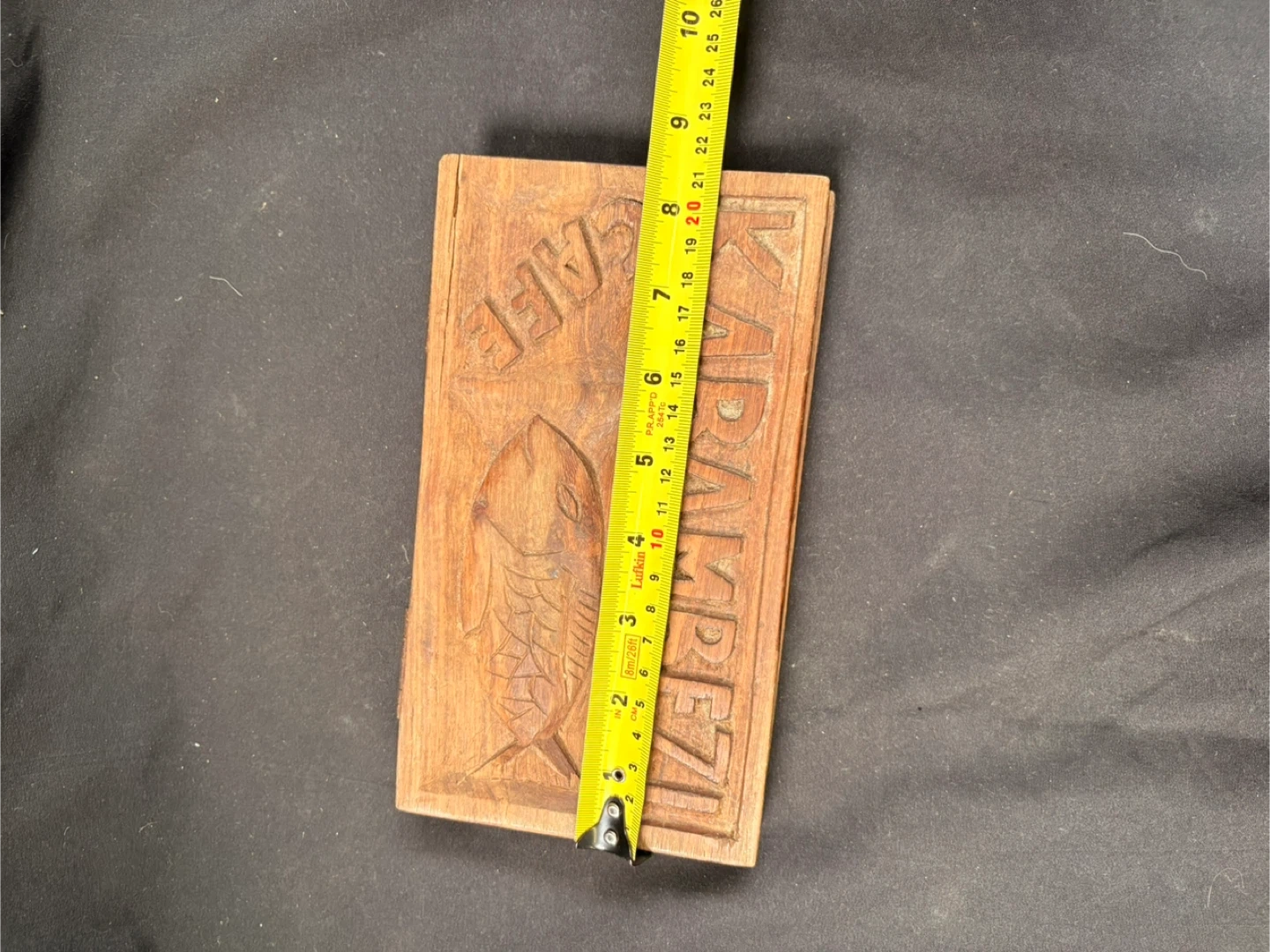 Good condition Hand Carved Wooden Box Selling a unique hand-carved wooden box. It has a fish design with the words "KARAMBEZI CAFE" carved into the top. The box is in good condition and would be perfect for storing small items or as a decorative piece