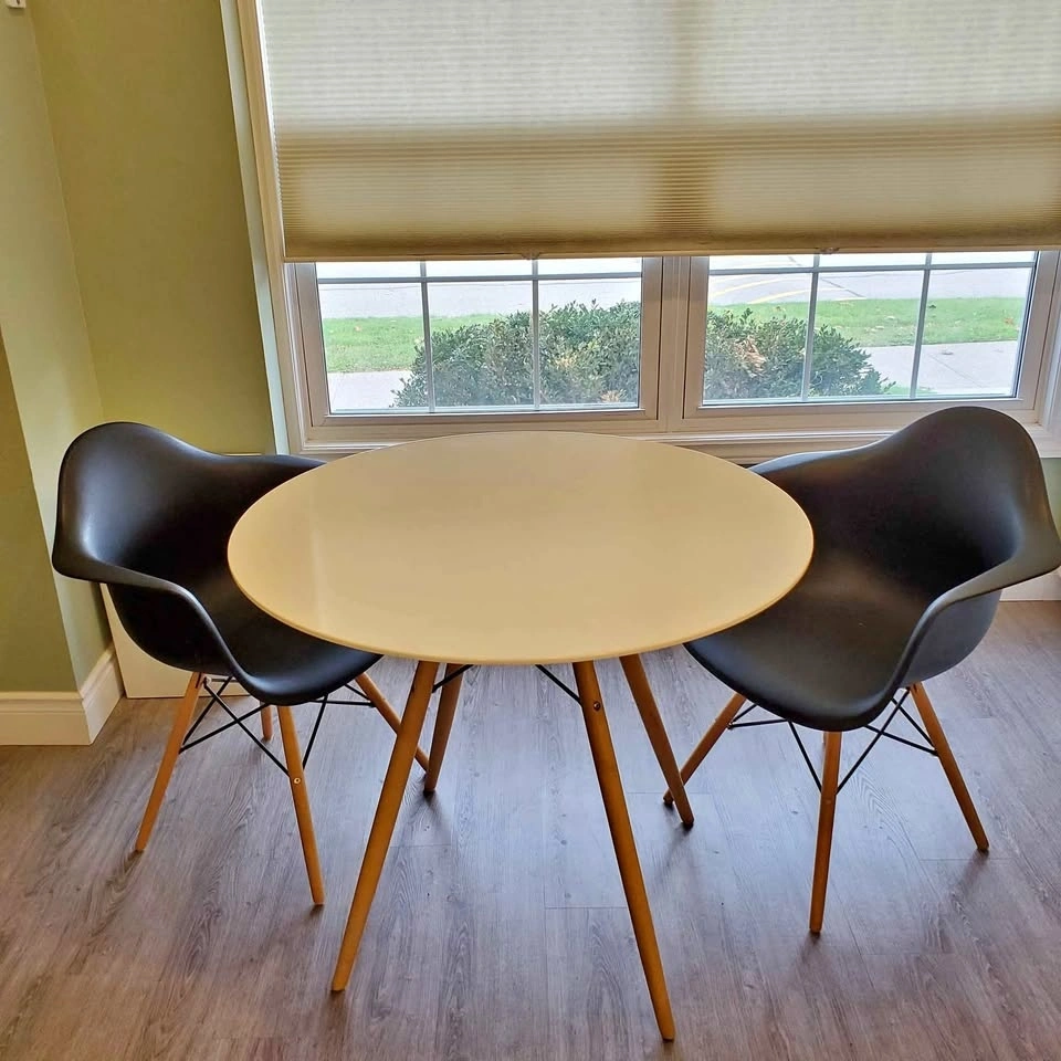 Simple, stylish, and perfect for small spaces! This modern 3-piece dining set includes a round table and two comfortable molded armchairs.