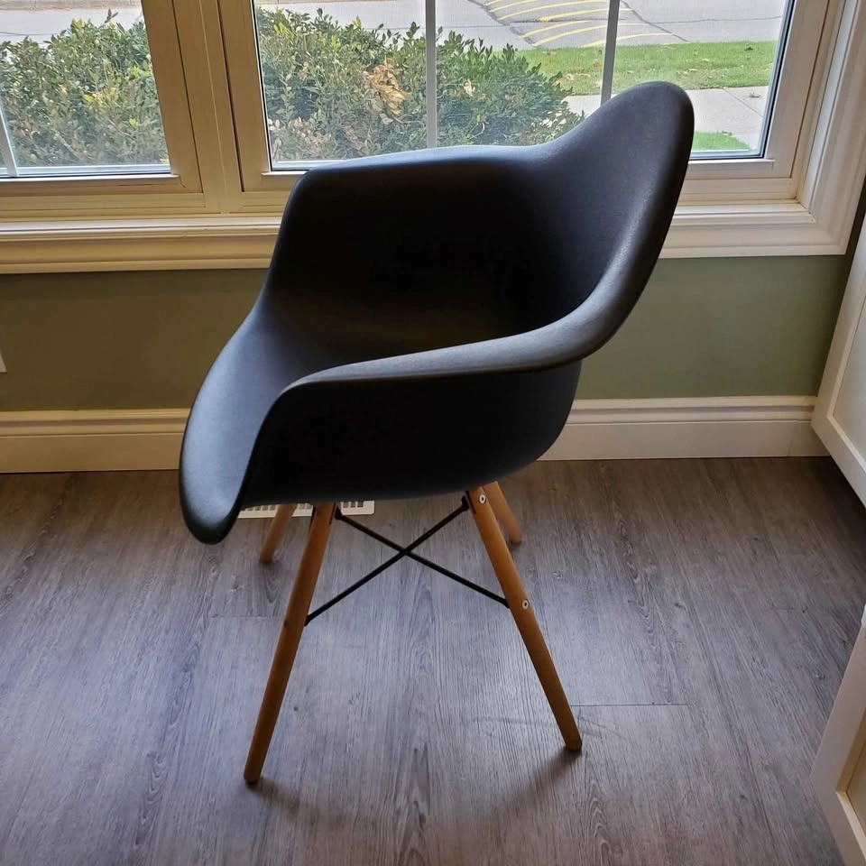 Chairs: sturdy molded plastic with wooden legs and metal supports