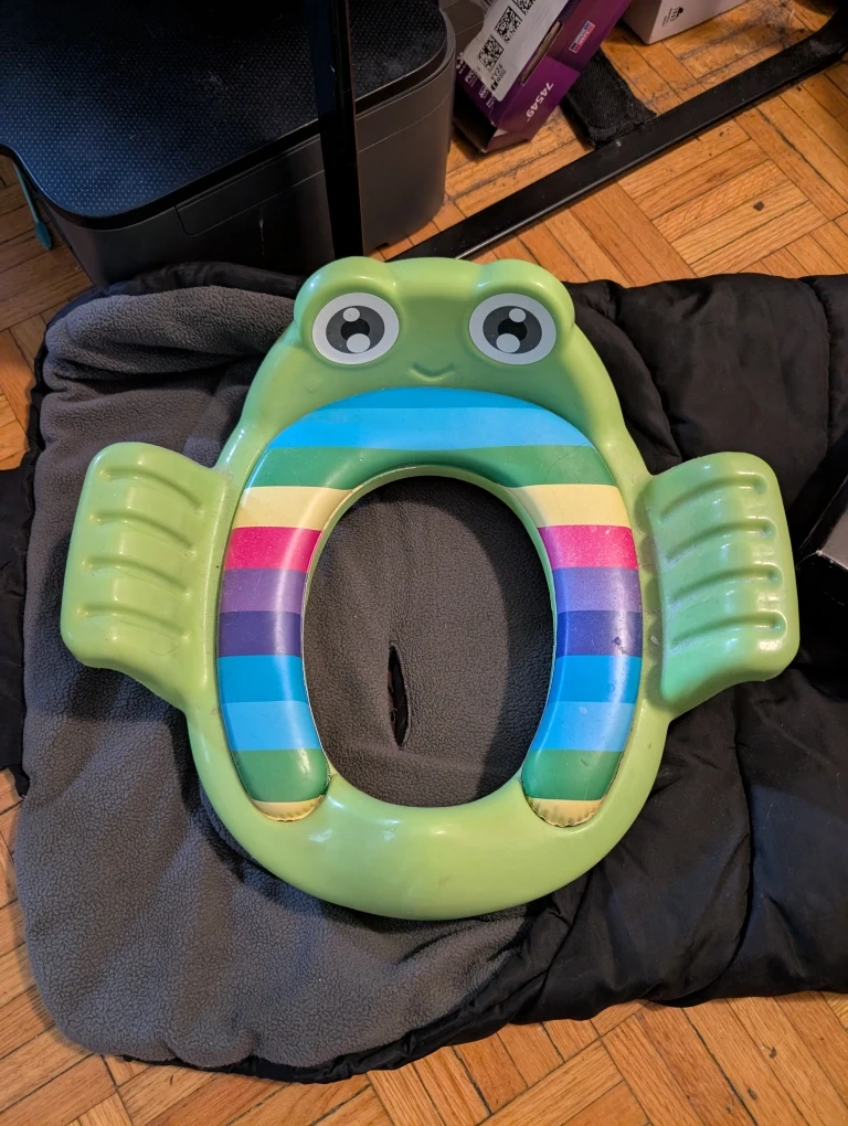This adorable froggy potty training seat is perfect for making potty training a fun experience for your little one! It features a colourful rainbow striped seat and a cute frog design. It's in good condition and ready for its next user!