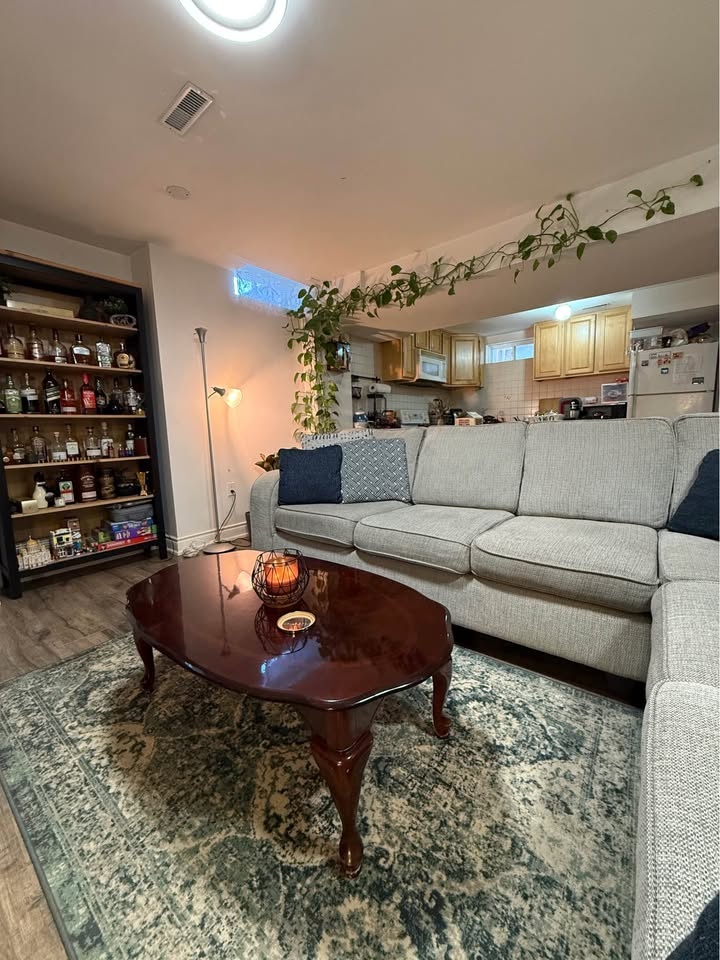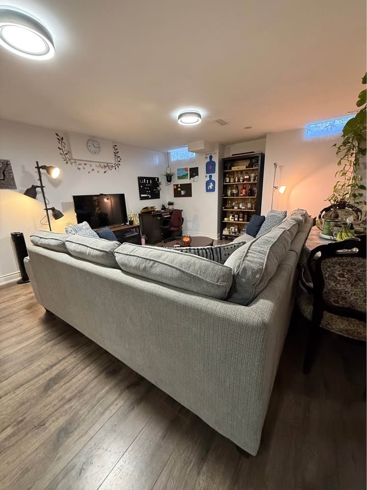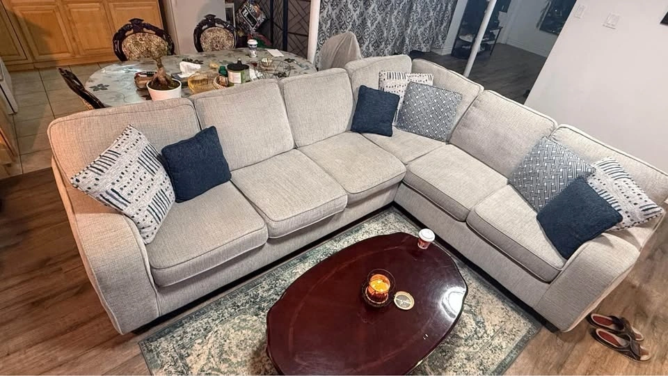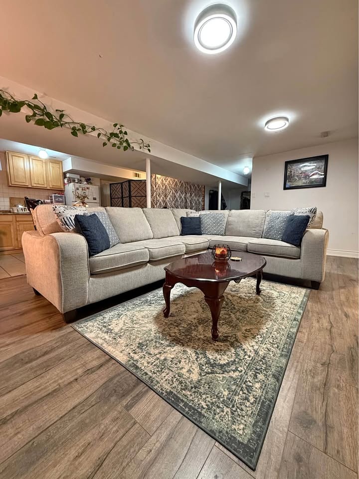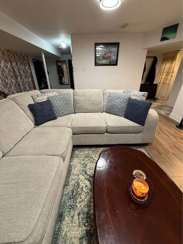 Selling my beautiful light-beige L-shaped sectional sofa, originally purchased from Bad Boy Canada for $2,250. It's in excellent, clean condition — no rips, no stains, no sagging. Comfortable, modern, and perfect for any living room or basement setup. Light beige/grey fabric, sturdy frame and firm cushions. Pet-free, smoke-free home. Comes with all back pillows. Very comfortable, no damage at all. Stylish dark wooden legs. Matching rug included at no extra cost. Reason for selling: Moving soon and can't take it with me. You need 31inch door size to pass it through the door. Dimensions are 10feet length x 8feet length x 3feet width x 3feet height. Sitting height 20inches from the ground.