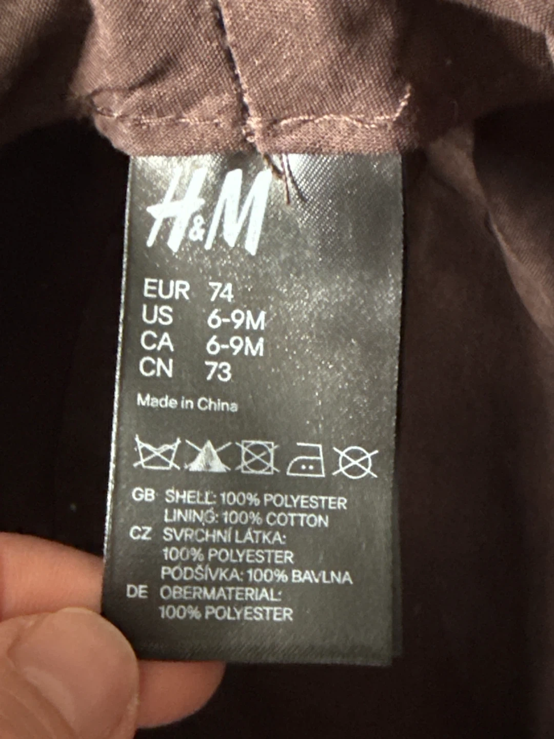 Here's a cute little fedora from H&M! It's a brown corduroy hat with a striped band. The tag says it's size 6-9M. The shell is 100% polyester and the lining is 100% cotton