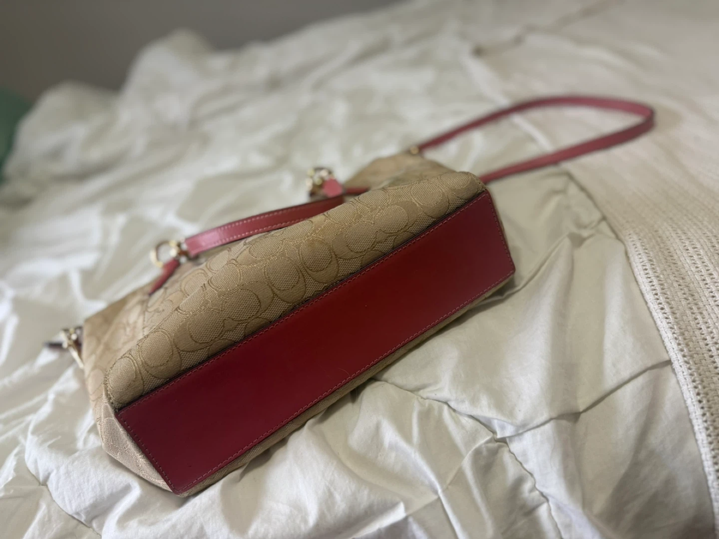 Selling a cute Coach satchel bag! It's in great condition and ready for a new owner. I only used twice. The bag features a signature Coach pattern and pink accents.