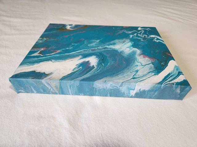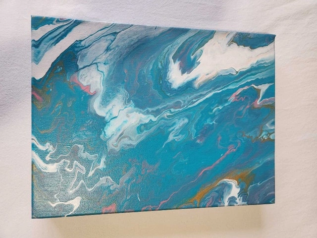 I'm offering a captivating acrylic pour painting, showcasing a mesmerizing blend of turquoise, white, pink, and gold hues, creating an abstract swirl of colour. This painting would be a great addition to any art collection. * Size: 8" x 10" * 31 cm x 23.5 cm x 4.5 cm * Material: Acrylic on canvas This unique piece is sure to add a splash of creativity to any room. If you're seeing this ad, it means the painting is still available, ready to find its new home!