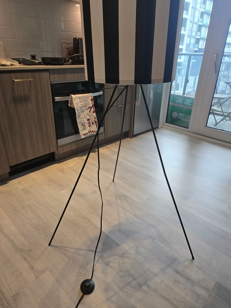 Selling a stylish floor lamp with a black and white striped shade. It has a modern look with a black tripod base. It would be a great addition to any room!